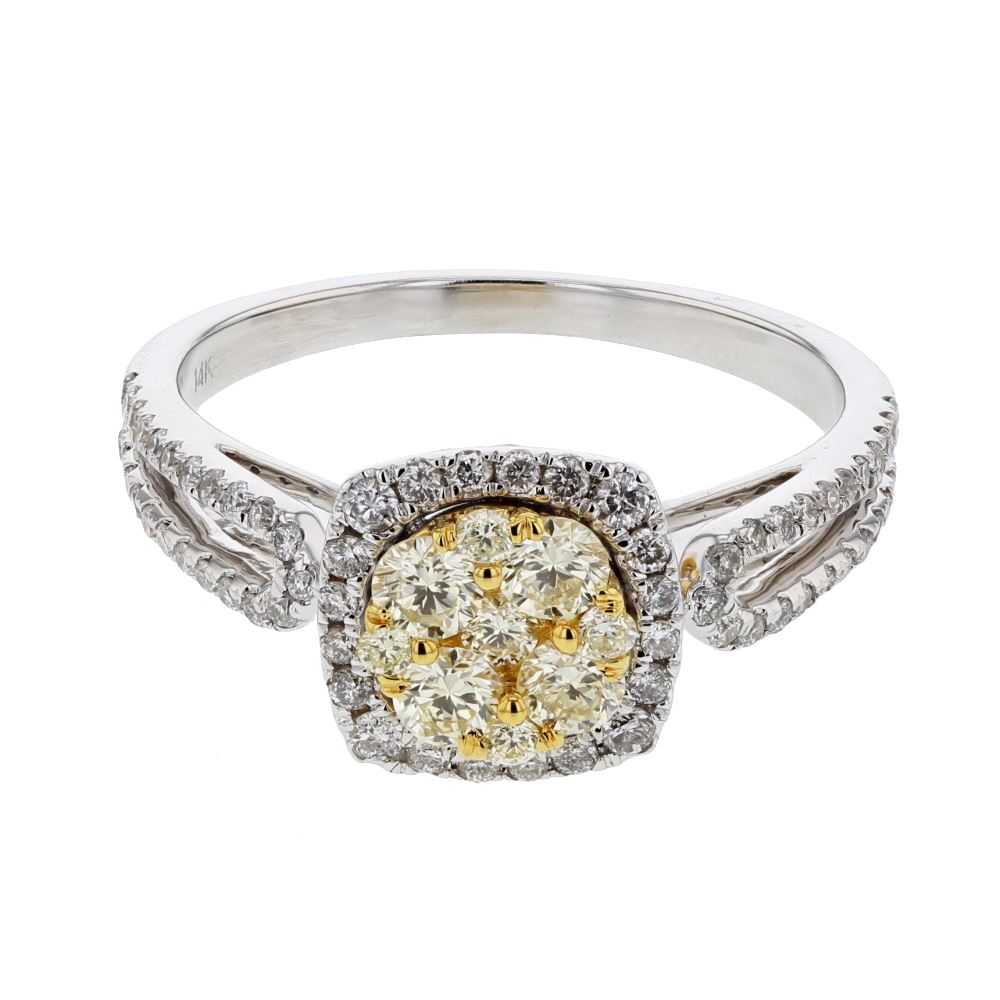 Round-cut Cushion-shaped Cluster Diamond Ring in 14K White and Yellow Gold | 438522 6.5 Grams, featuring 0.35 Yellow Diamond Round ct 66 0.46 ct 9 ct 14 ct