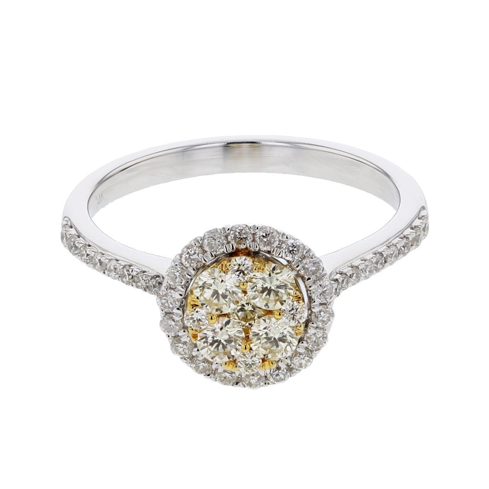 Round-cut Single Halo Single Shank Cluster Diamond Ring in 14k White and Yellow Gold | 437978 6.5 Grams, featuring 0.29 Yellow Diamond Round ct 36 0.36 ct 9 ct 14 ct