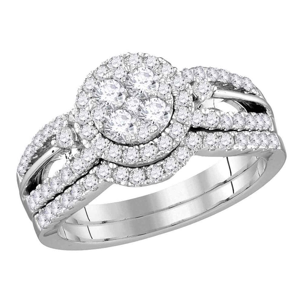 REF-76M5H ---- Round Diamond Cluster Bridal Wedding Ring Band Set 1 Cttw 14kt White Gold