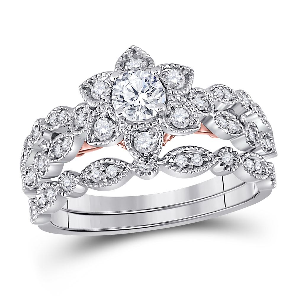 REF-93K9Y ---- Round Diamond Flower Bridal Wedding Ring Band Set 3/4 Cttw 14kt Two-tone Gold