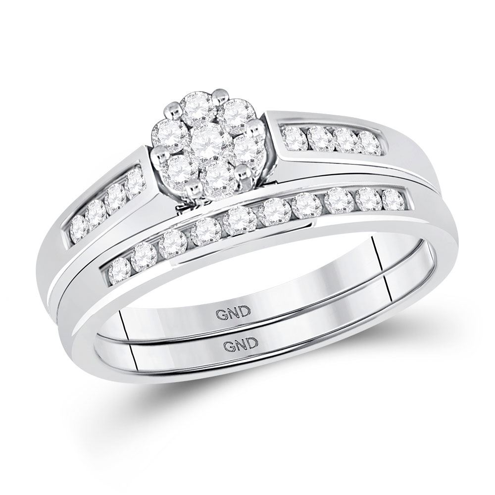 10kt White Gold Round Diamond Flower Cluster Bridal Wedding Ring Set 1/2 Cttw