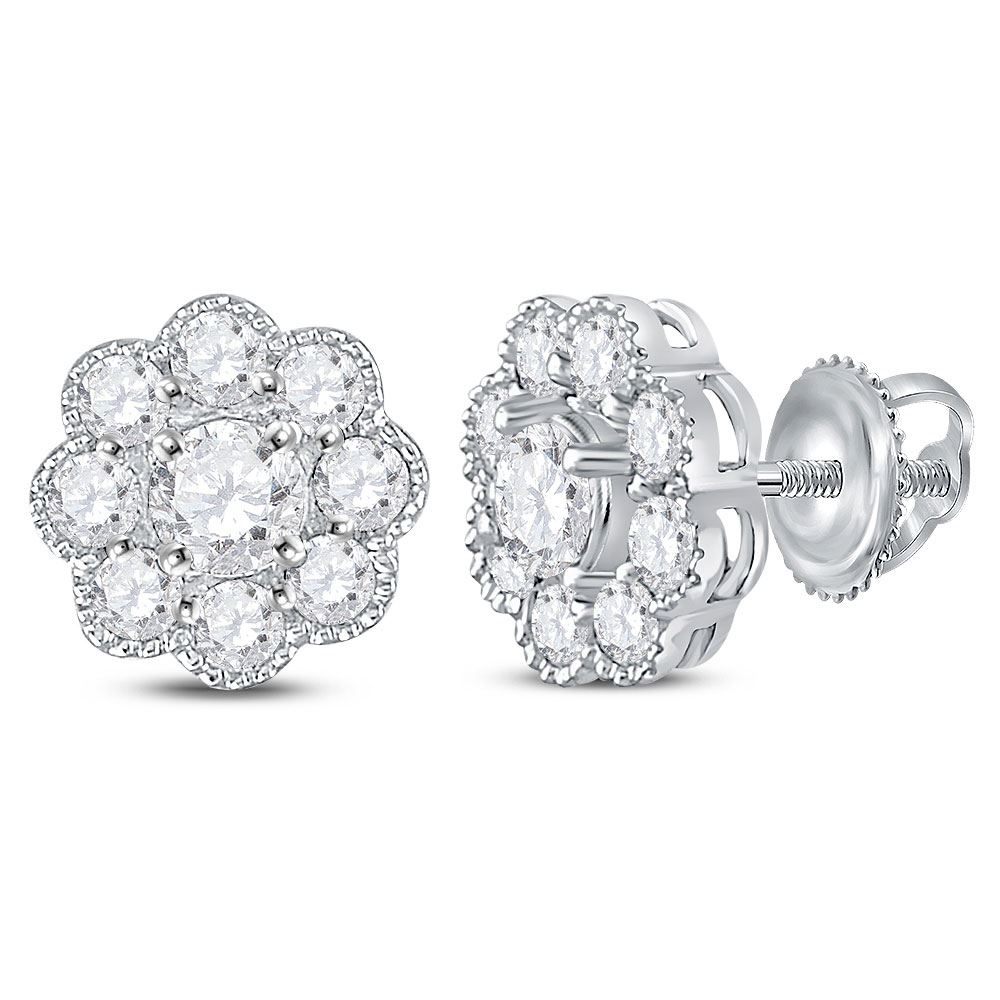 Round Diamond Flower Cluster Stud Earrings 1 Cttw 14KT White Gold