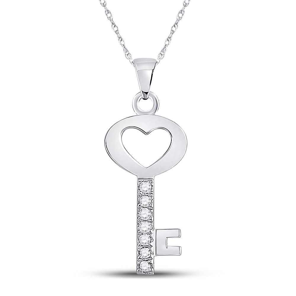 10kt White Gold Womens Round Diamond Key Heart Pendant 1/20 Cttw.