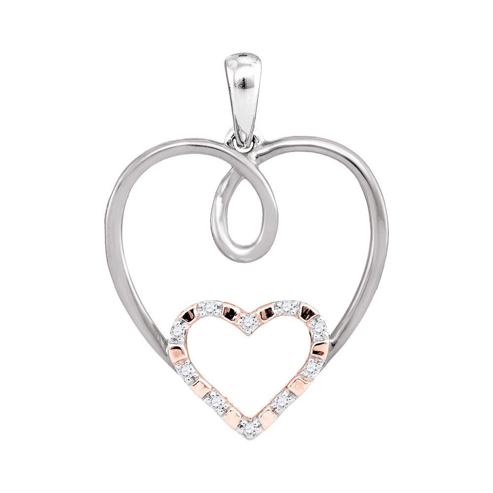 10kt White Gold Womens Round Diamond Rose-tone Double Nested Heart Pendant 1/20 Cttw.