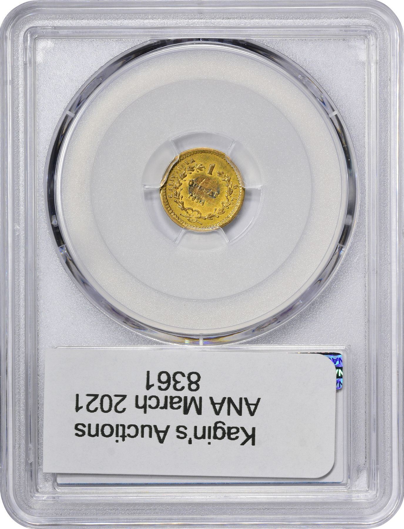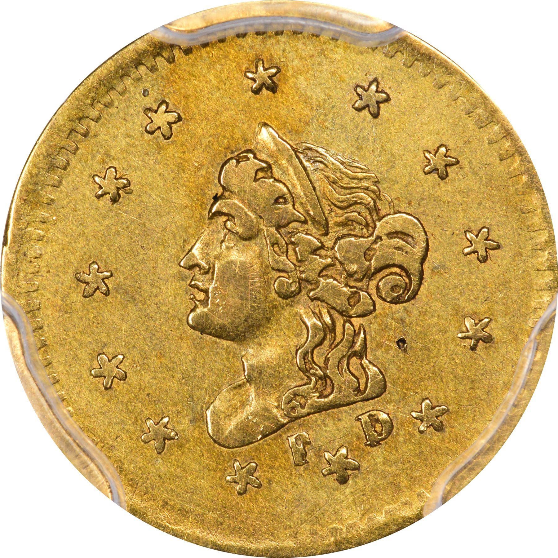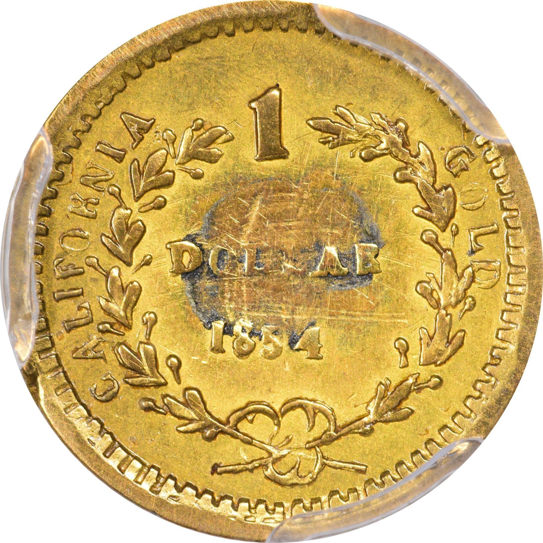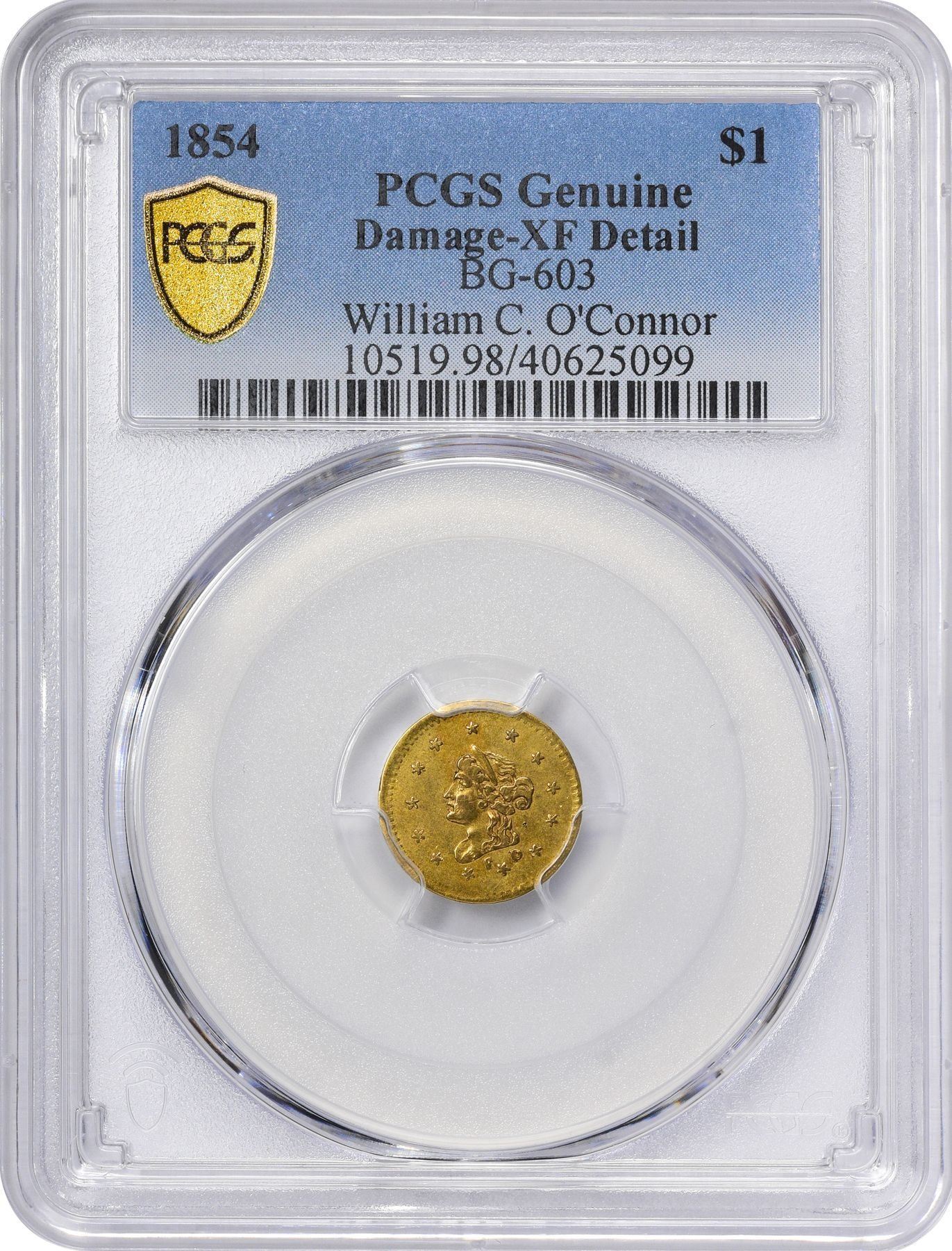 Description: 1854 F D round One Dollar, BG-603. PCGS Genuine, Damage – XF Detail. High Rarity 6. Same bust, star divides F D; same reverse. Signed by Frontier, Deviercy & Co. Removed from stickpin, so damage to center of reverse (balance AU); obverse more worn, but with clean fields. Yellow gold, barely noticeable toning. PCGS Genuine, Damage – XF Detail William C. O’Connor (PCGS# 10519).