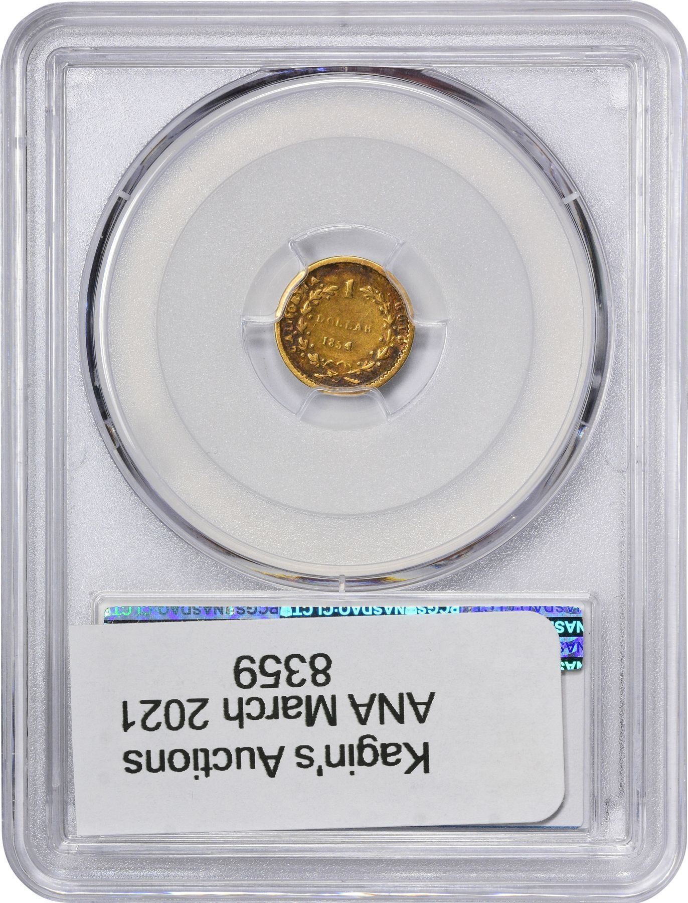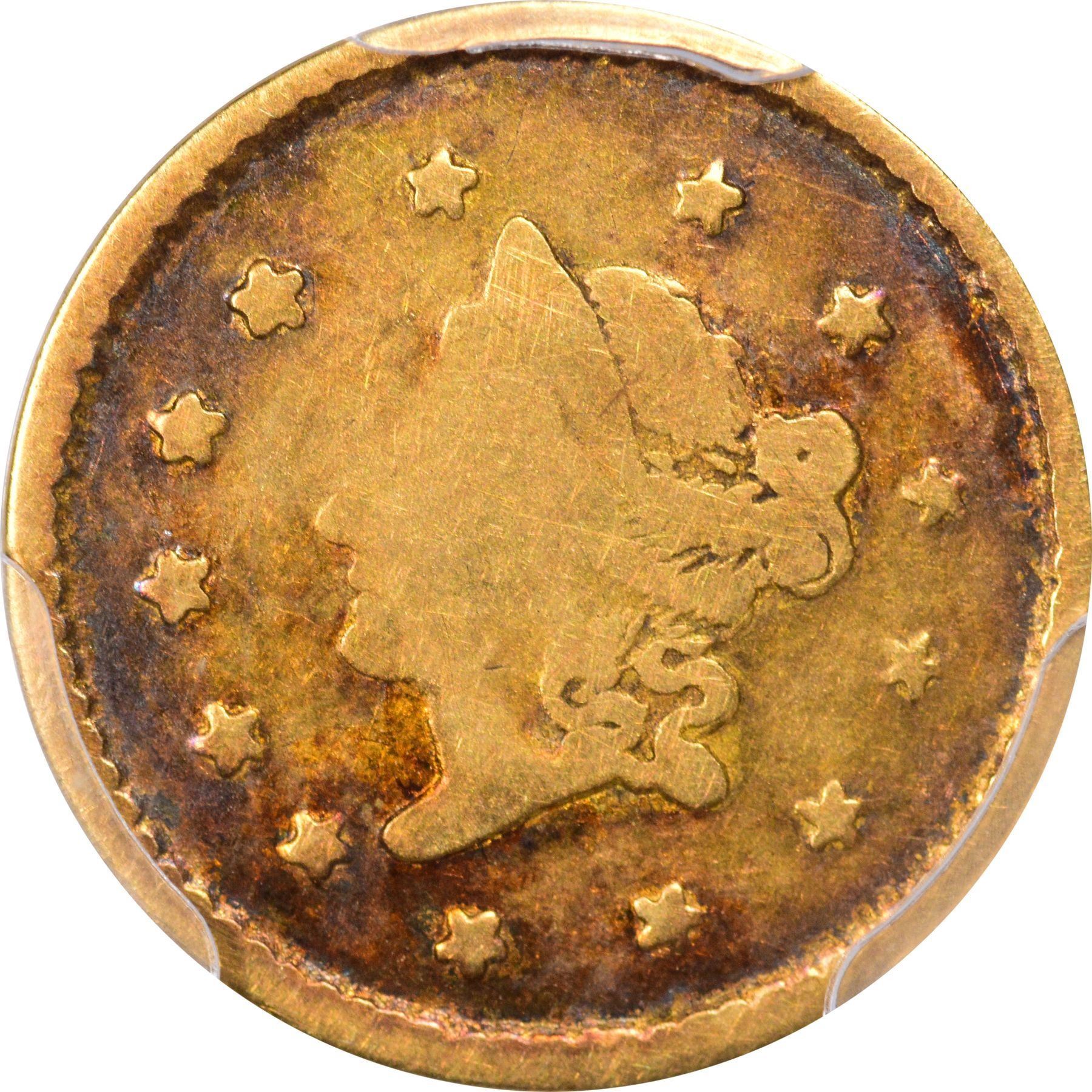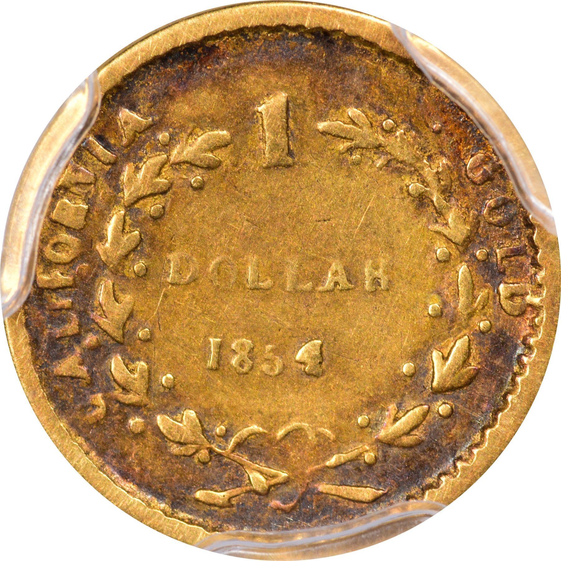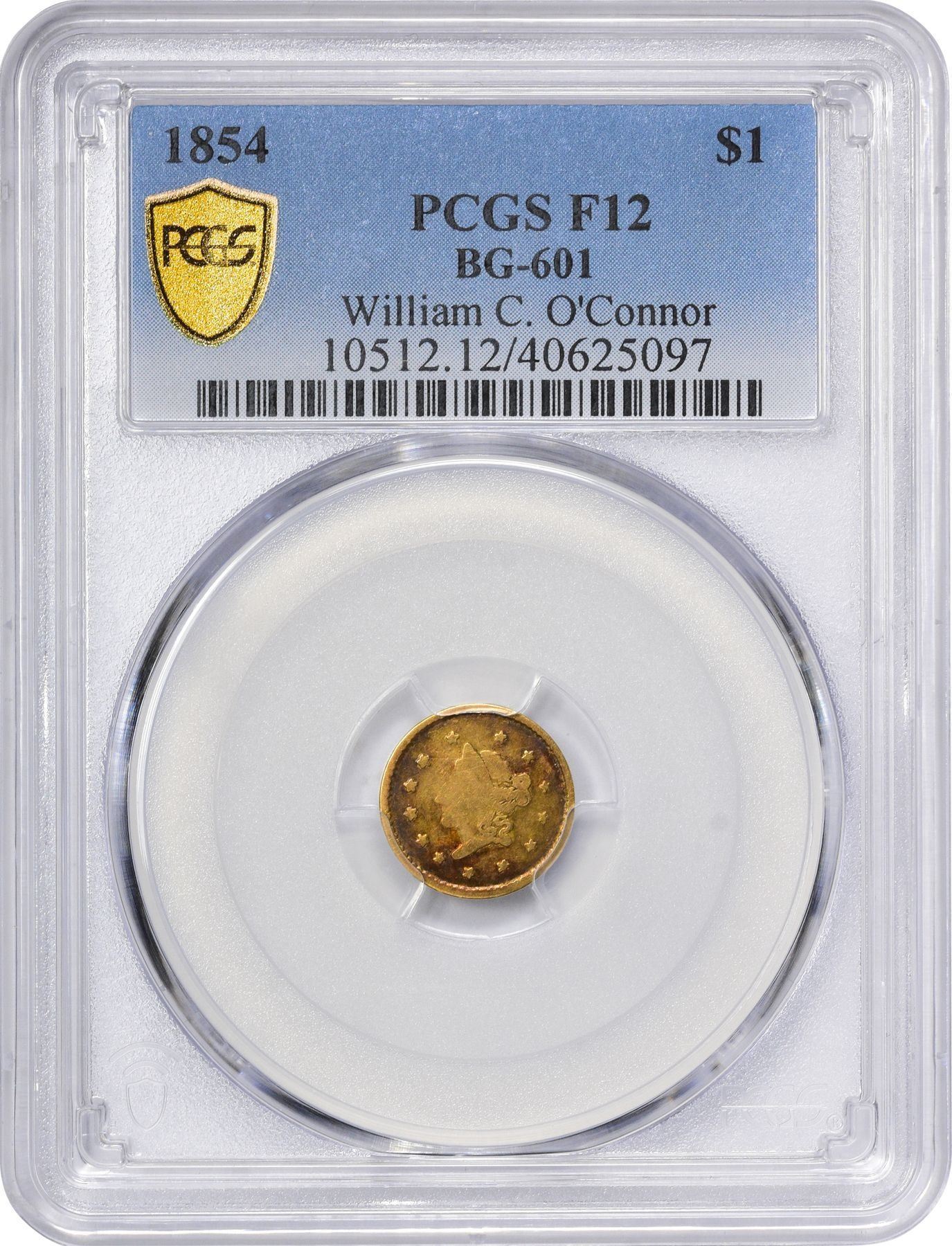 Description: 1854 F D round One Dollar, BG-601. PCGS F12. Rarity 8. Even in Gold Rush San Francisco, the jewelers who made small California gold pieces were not certain that a dollar emulating the U.S. coin, but containing less gold, could be minted with perfect safety, because of a certain well-known law. Consequently, all round dollars are rare, and Period One round dollars are rarer than those of Period Two. Thus, they are the key to every type set of small California gold coins, from the short set of six pieces—one of each denomination and shape—to every larger type and Registry™ Set. Of course they are highly desired for complete sets as well. Small head, 13 five-pointed stars; 6 pairs of berries on each branch. Unsigned, but same head as on Frontier & Deviercy’s signed octagonal dollars. Even wear; reverse clear, but weaker on hair and borders. Yellow gold with bluish toning around periphery both sides. PCGS F12 William C. O’Connor (PCGS# 10512). PCGS POP 1 + 1.