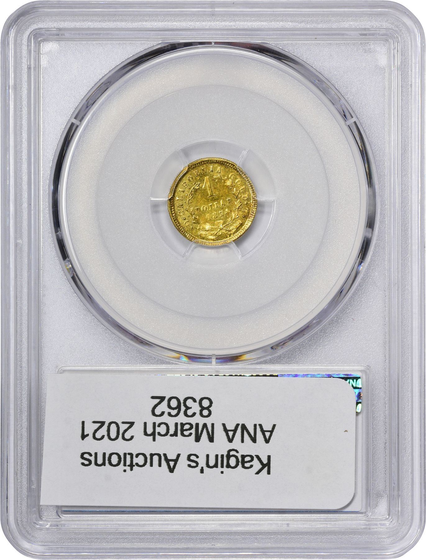 Description: 1854 G L (George Ladd?), by Frontier, Deviercy & Co., round 1 Dollar, BG-605. PCGS Genuine, Cleaned - UNC Detail. High Rarity 6/Low Rarity 7. Coarse Liberty head, from the device punch of BG 501, 513, but modified: longer nose and angular extra outlines to back curls; 13 stars around, almost touching border, with tip of bust pointing to top of 1st star; value and date in wreath, elaborate long folded ribbons; * G * left, * L * right about level with date, berries all paired except that lowest outside one on each branch is triple; crack from rim to lowest left berries. Looks Brilliant Uncirculated, and was so graded as the finest known in Breen-Gillio. PCGS Genuine, Cleaned - UNC Detail William C. O'Connor (PCGS# 10521).