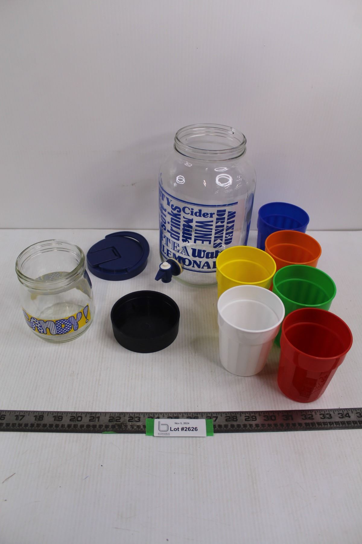 Round Glass Candy Jar 4"x5.5" & Round Glass Drink Dispenser 6"x10" w/ (6) Plastic Cups