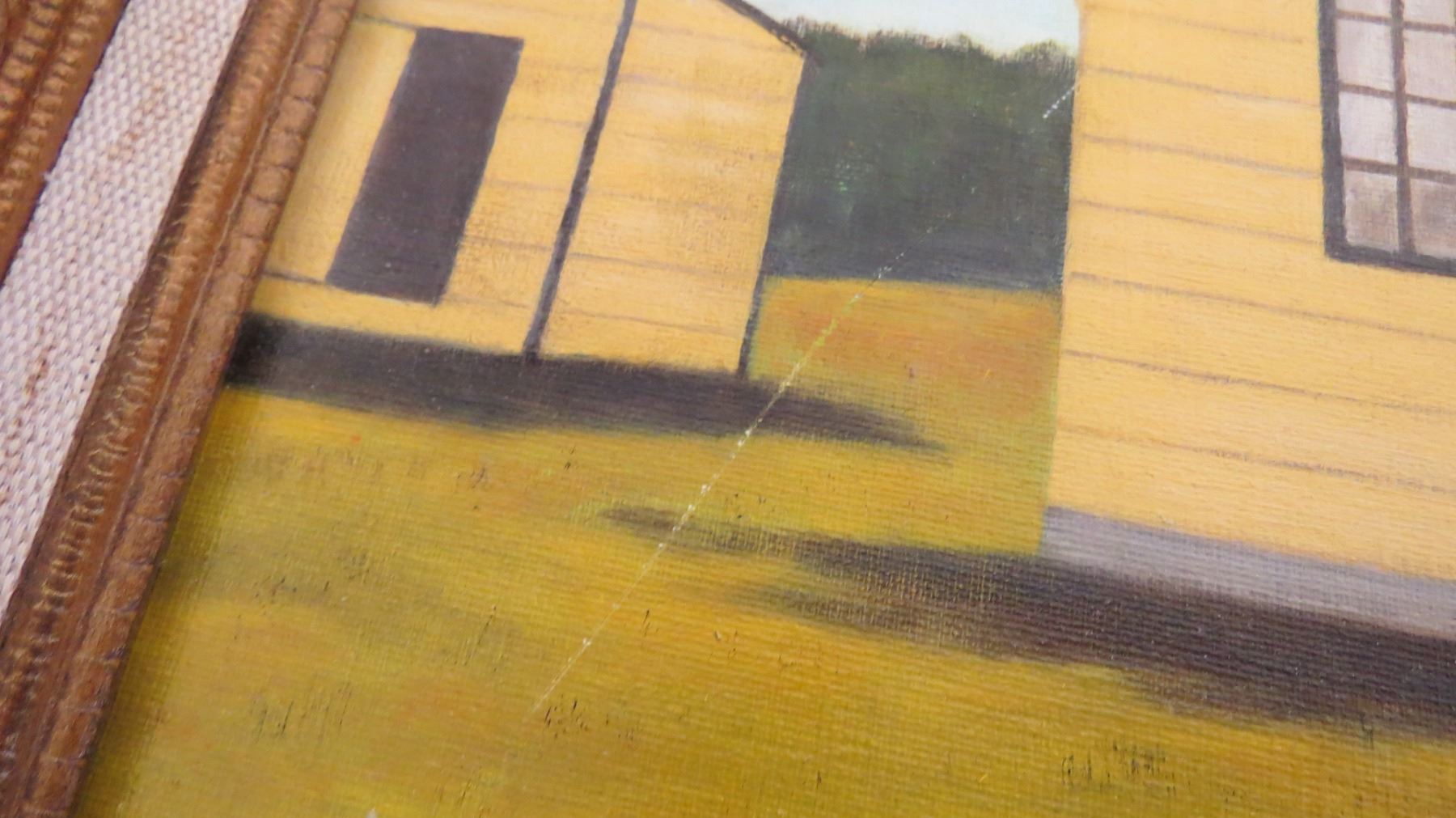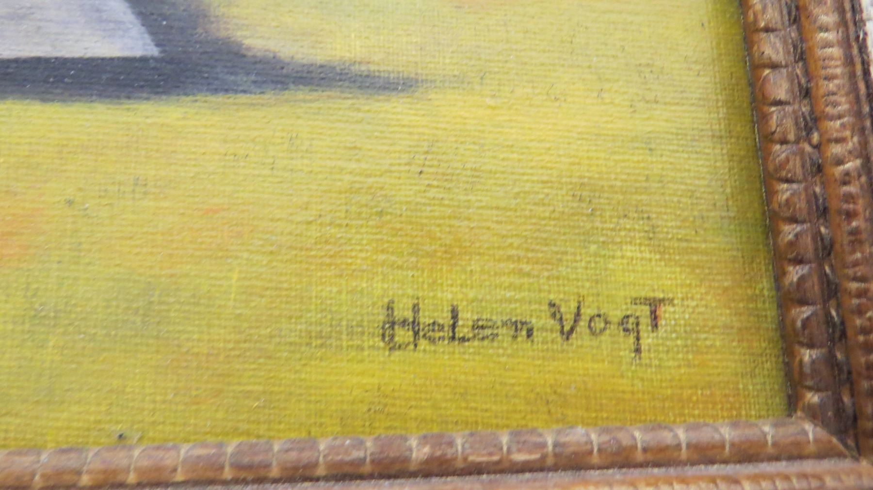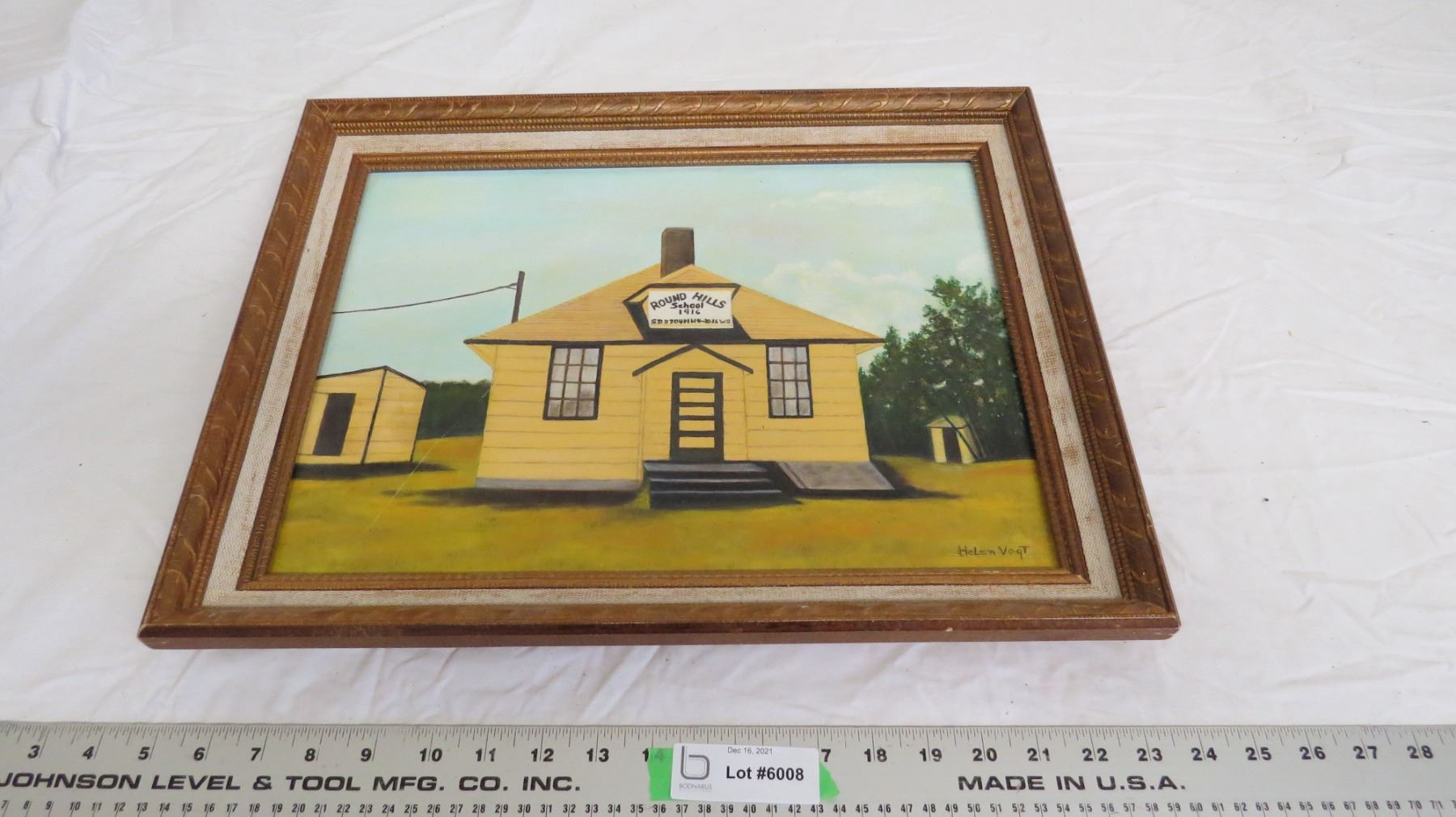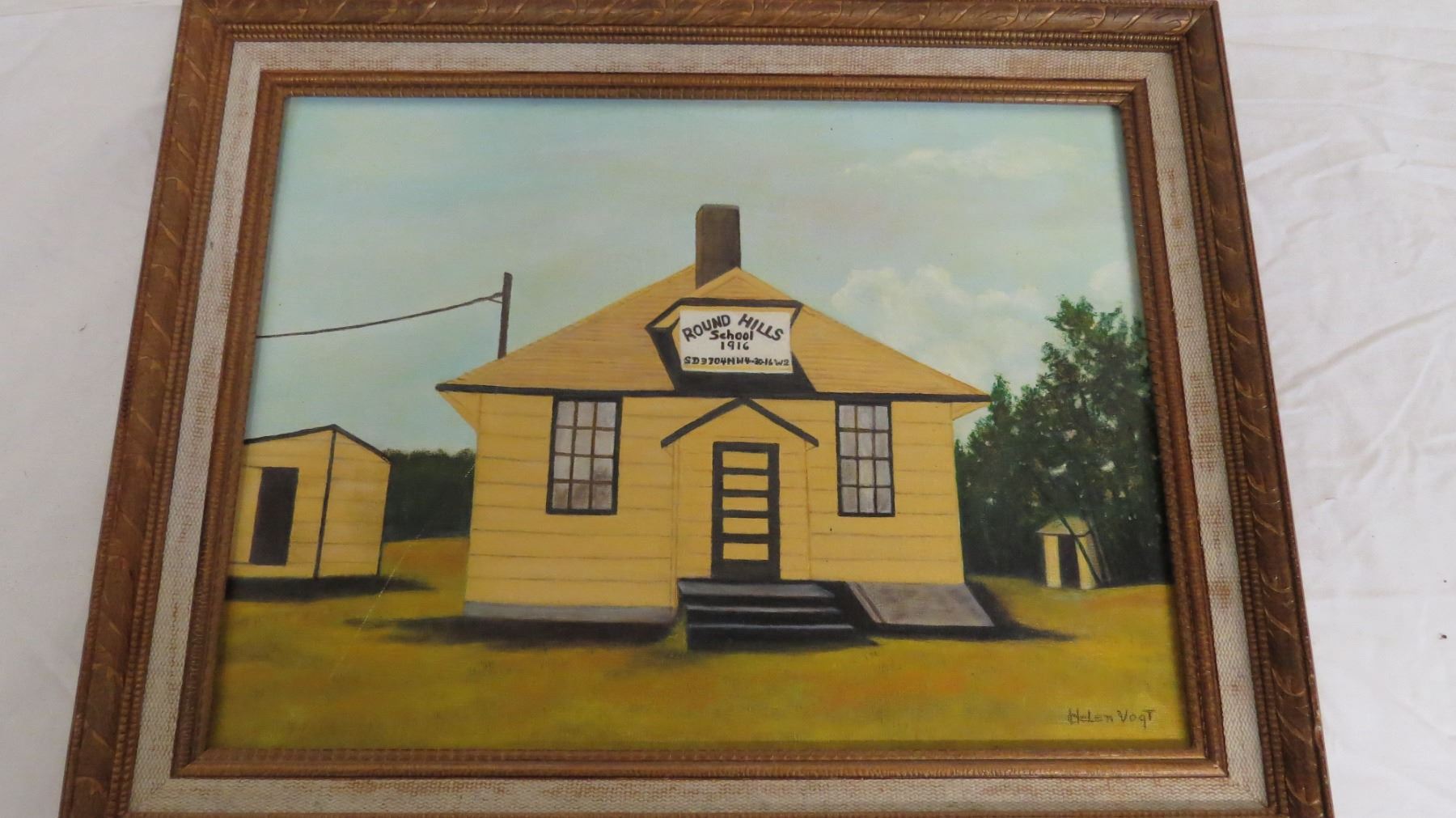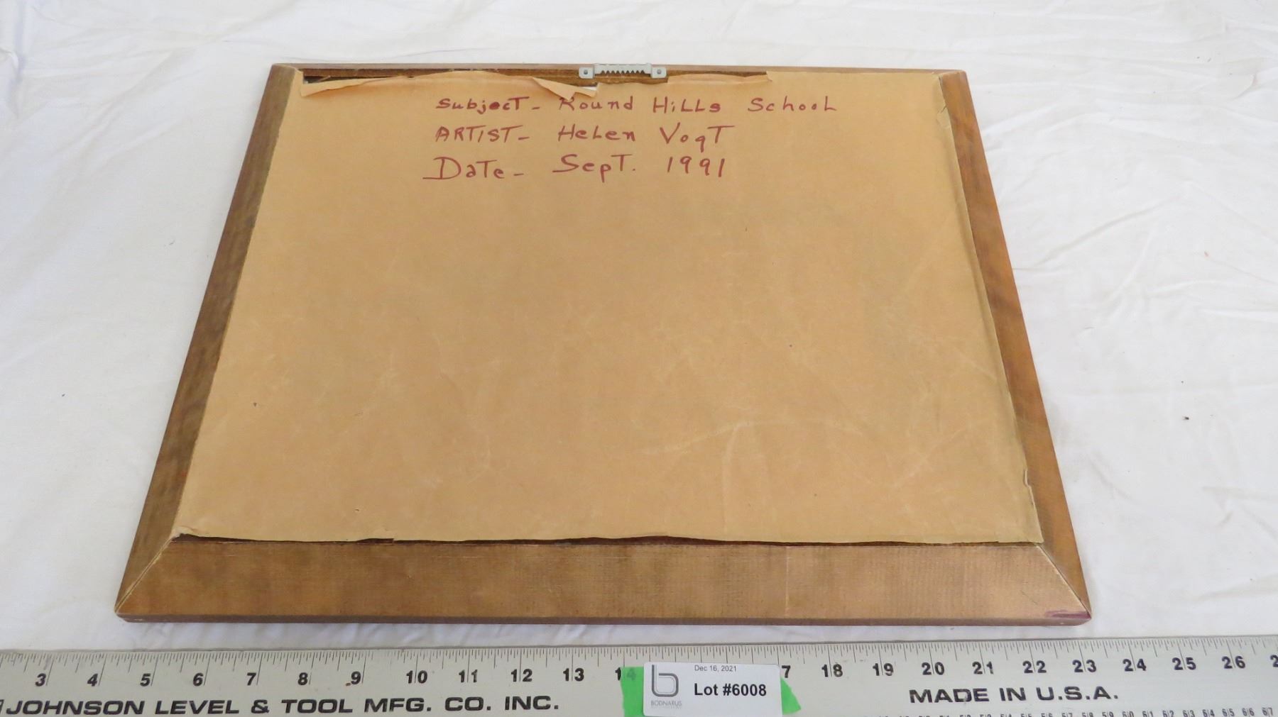 Round Hills School (canvas painting?) in frame by Helen Voqt - 15x19
