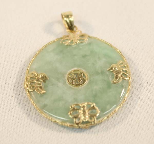 Round Jade 14k Gold Pendant. Jade with 14k gold round pendant. Measures 1'' diameter.