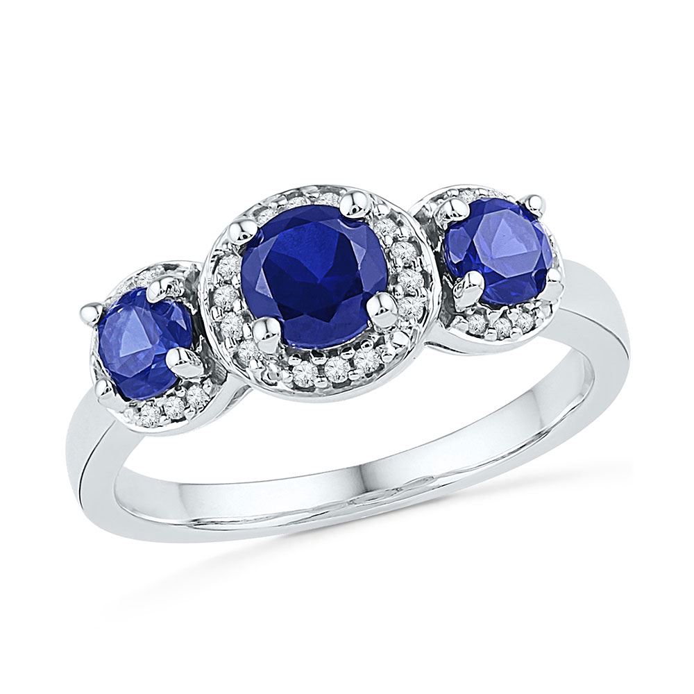 REF-25W5H - SKU: GD100620 ---- Round Lab-Created Blue Sapphire 3-stone Diamond Ring 1-3/8 Cttw 10kt White Gold