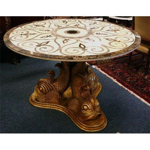 This is an exquisite "Uber Premium" inlaid marble top dining center side table with a finely carved giltwood base featuring dolphins. This magnificent table will be a focal point in any interior....a must for the connoisseur of fine furniture!
