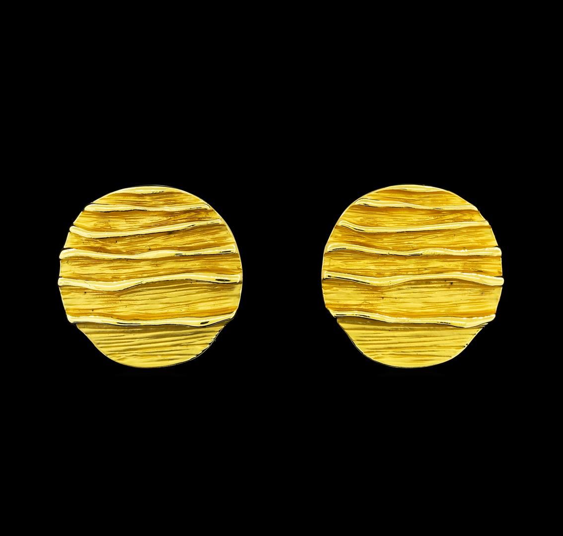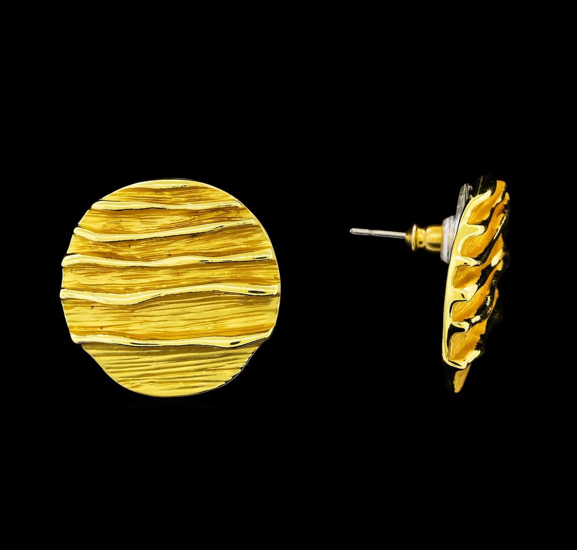 High end designer jewelry. Round Medallion Earrings - Gold Plated. 18 K Gold Plated Matte Metal. Gold. Stud.