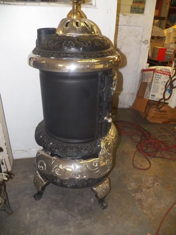Round Oak Stove completely refurbished. Approx 58" tall x 28" wide including skirts. Stove is in working condition. Very Nice