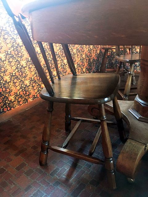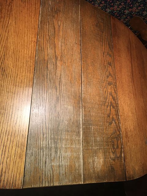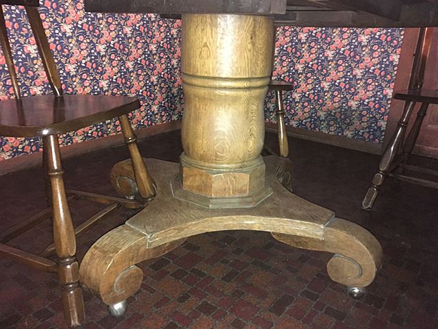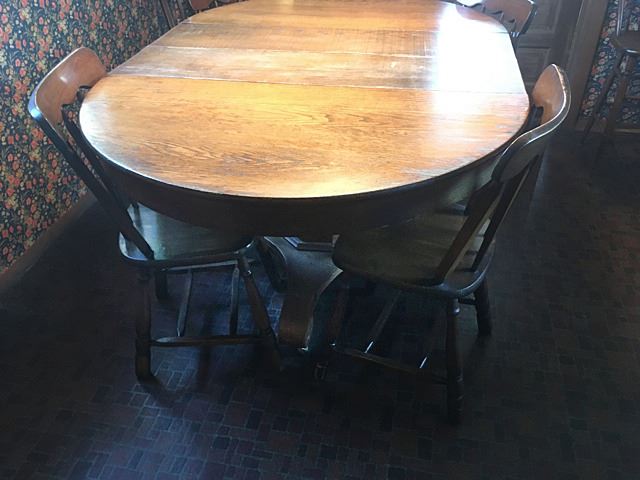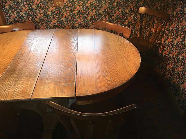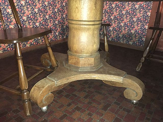 Round oak pedestal table with 2 leaves, large pedestal base, solid, with 5 matching chairs, from the farm.