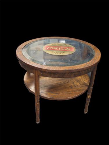 Round Oak Side Table w/ Beveled Glass & Coke Decal