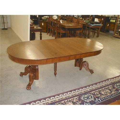 Here is a 44 inch round, tiger stripe oak, dining table with three 14 inch leaves extending the table to 86 inches long. The table has a large tiger stripe design as does the 3 table leaves. The table leaves are made from solid quartersawn oak with matching table skirts including the rope twist molding...and match the table perfectly..to give a formal look at all times. The table center pedestal splits to expand the table. Ornately carved clawfeet and legs adorn the center pedestal. This is a great looking table for everyday use or for a formal place in your home.