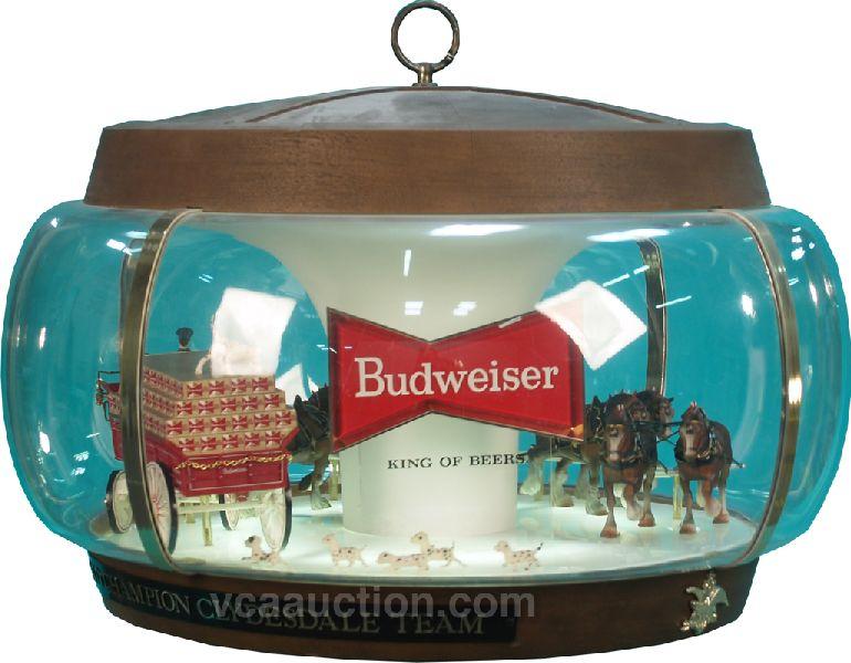 Round Plastic Light-Up Rotating Hanging Budweiser Beer Sign, w/ wagon & clydesdales in middle (light works) - approx. 24" diam