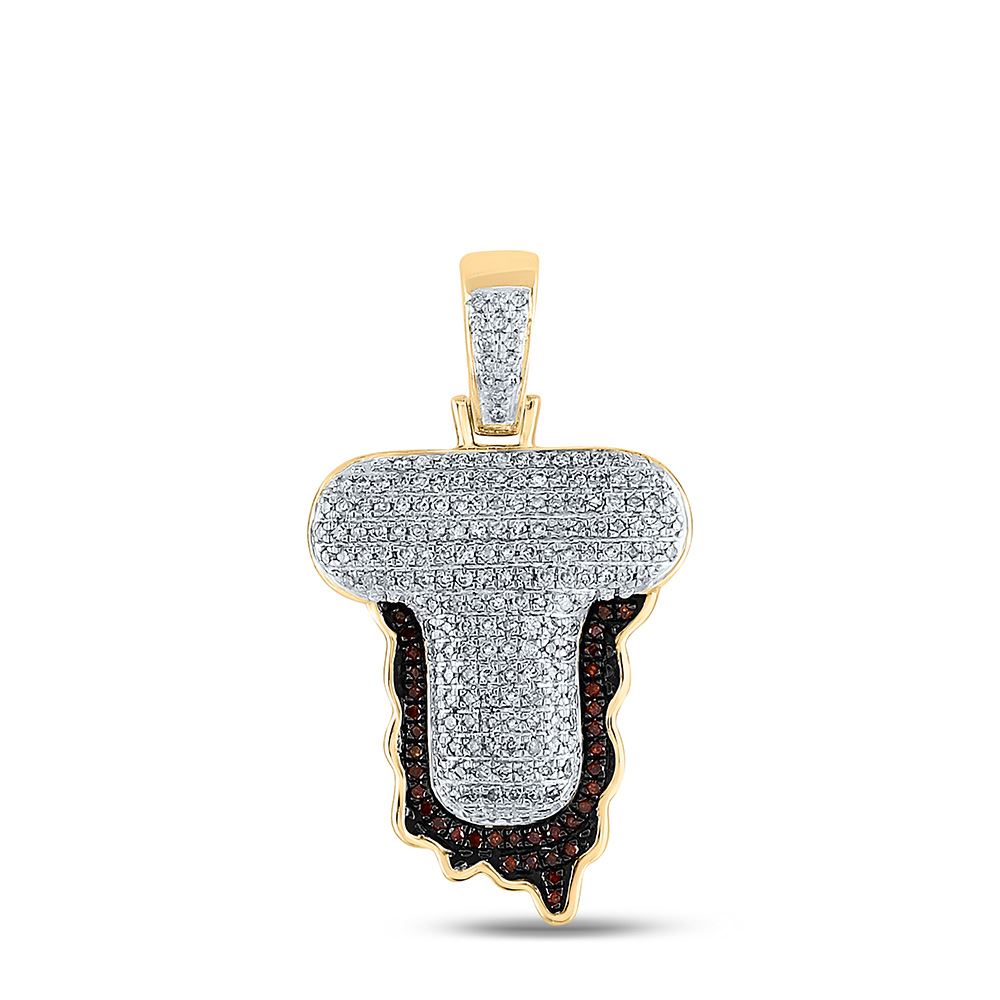 10kt Yellow Gold Mens Round Red Color Enhanced Diamond Letter T Blood Charm Pendant 5/8 Cttw.