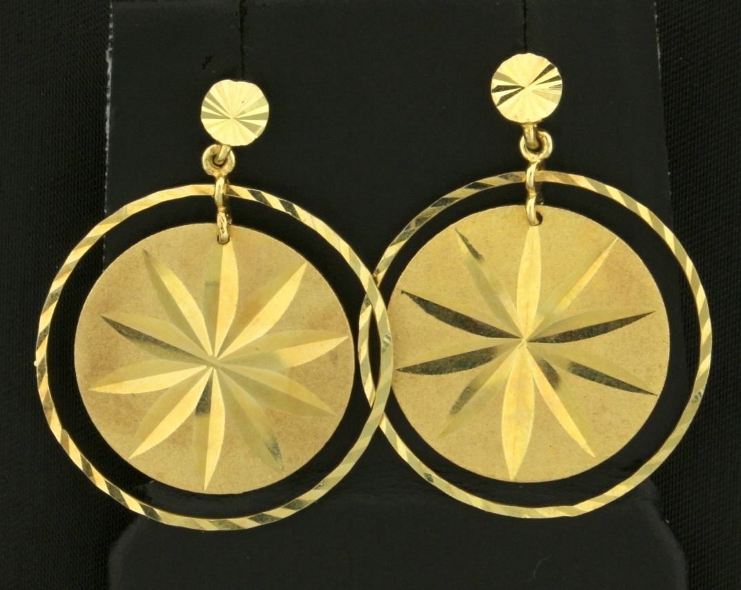 In 14k yellow gold, circular star design surrounded by ring - both dangle. 1 1/2 inch long. No backs. 5.4g.