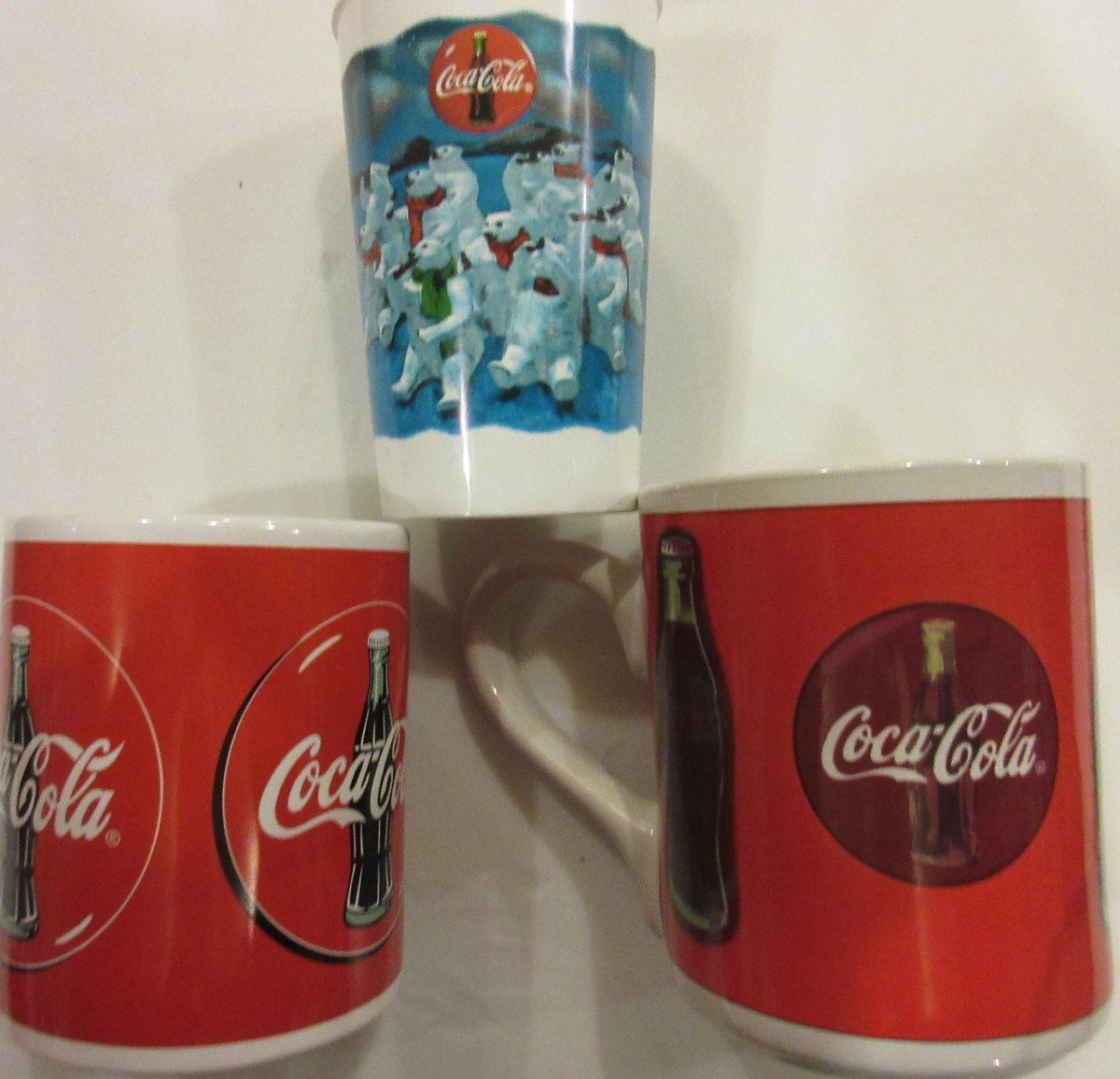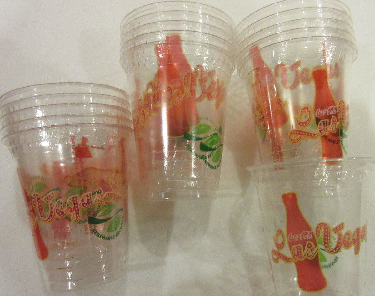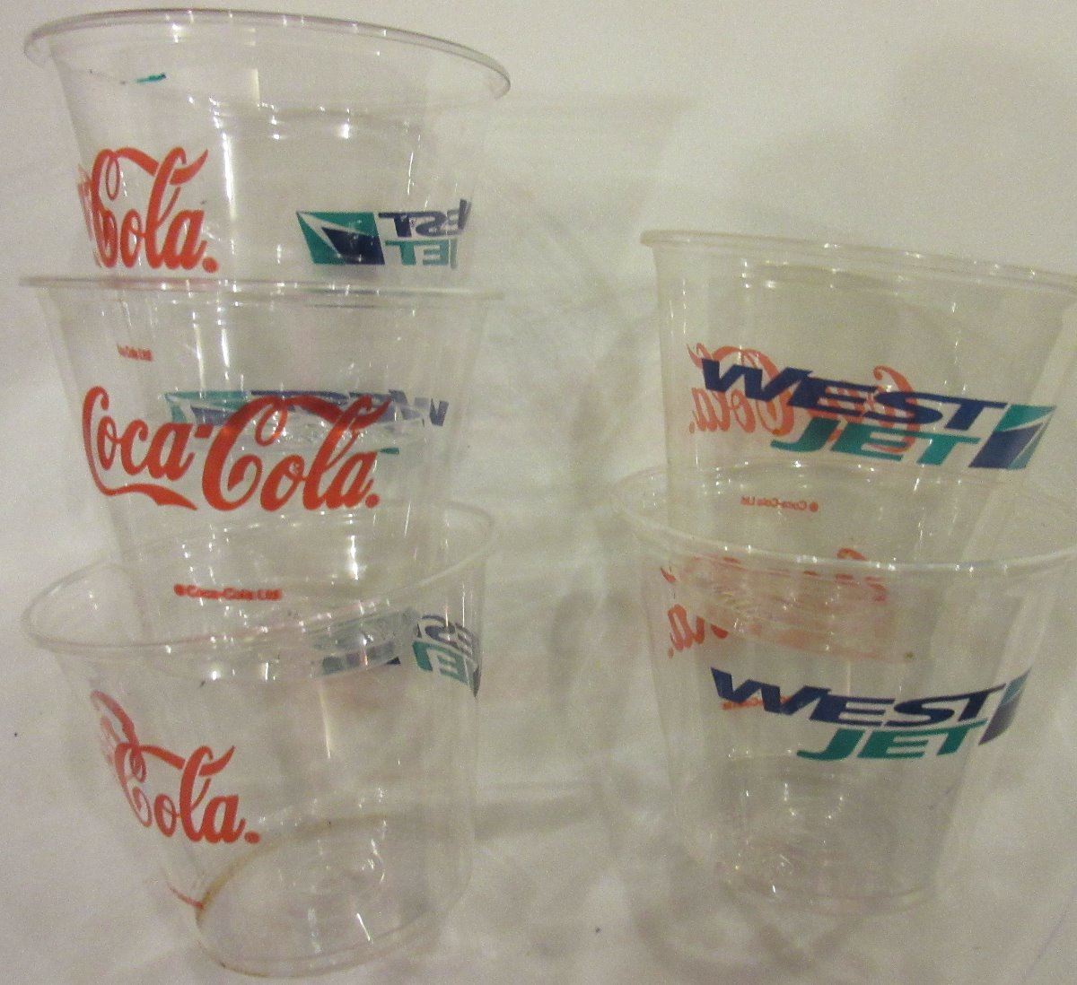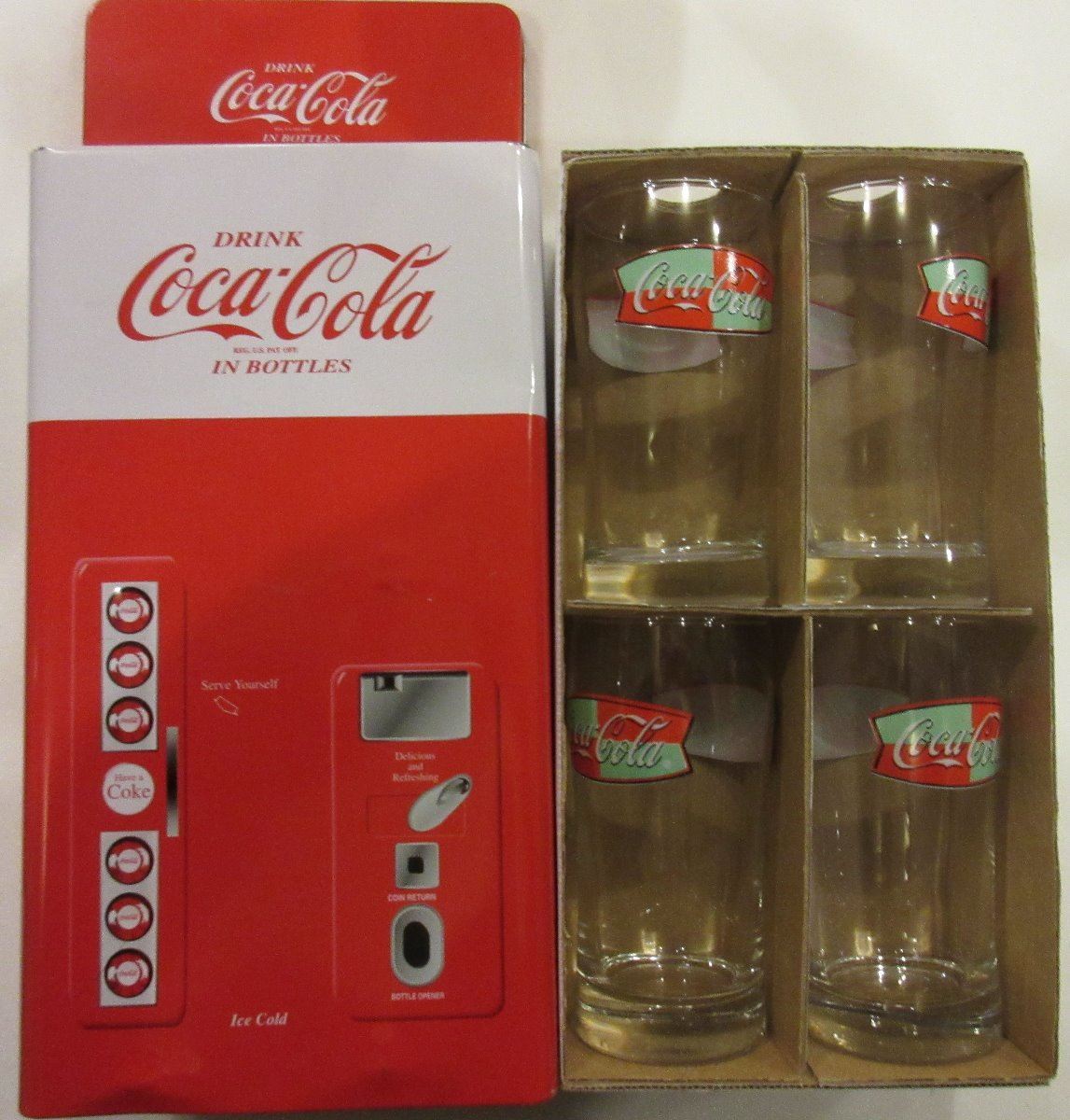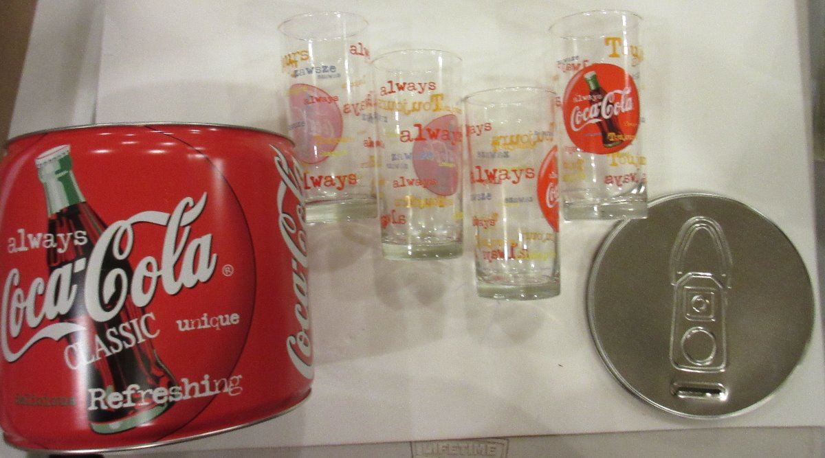 Cola Cola Coke beverage $ glasses in original Round Coke Tin with lid, 5 plastic Westjet/Coca Cola , $ glass in a Vending Machine Style metal container, 15 La Vegas Tasting plastic glasses, 3 Plastic Vanilla Coke, 2 Mugs and 1 plastic Polar Bear