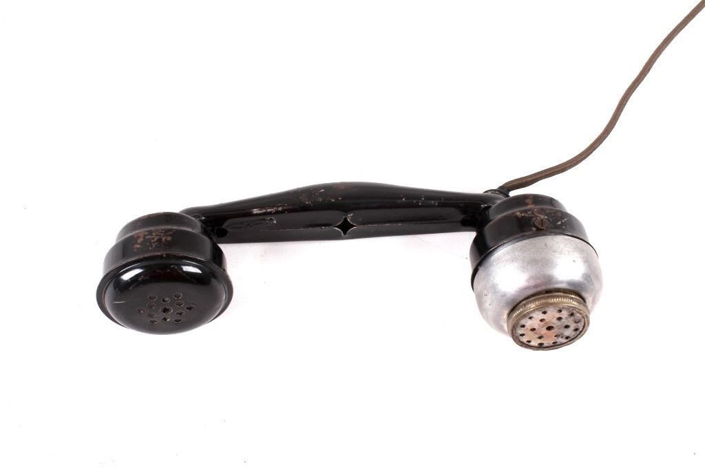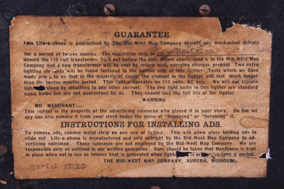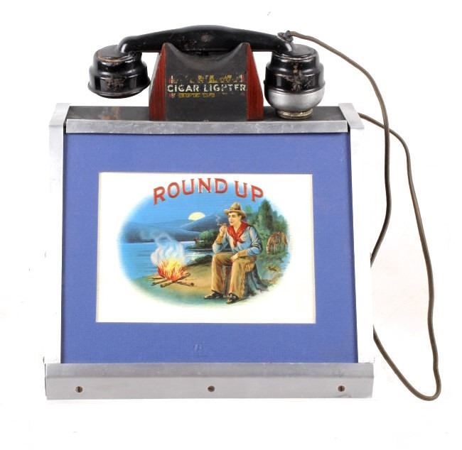 Offered in this lot is a Round Up Cigars advertising Lite-O-Phone manufactured by the Midwest Map Company. These Lite-O-Phones were used by many different company's to advertise products and were typically set in common places like hotel lobbies. The Lite-O-Phone is plugged into a standard 110 volt socket and upon picking up the headset the lighter will heat up allowing your cigar or cigarette to be lit. This Lite-O-Phone shows an advertisement for Round Up cigars from Celestino Costello & Co which was the top cigar manufacturer in New York during the late 1890's. Their crate packing read "10,000 Round Up Cigars" which is present in the advertisement on the back of the phone. The front ad shows a cowboy sitting next to the lake with his horse and fire enjoying a Round Up cigar. The Lite-O-Phone is in very good condition for its age with minor loss of finish mostly to the lighting mechanism. The cigar lighter has been tested and does work. It measures 10.5" x 7.5" x 11".
