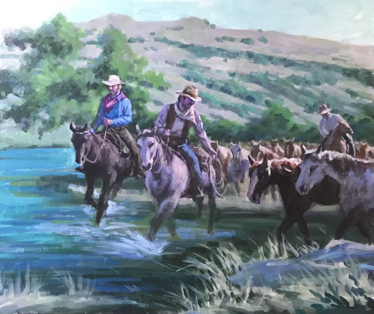 Cowboys bringing in a new herd. Original acrylic on 20x24" stretched canvas by American artist Richard Ho. w/COA