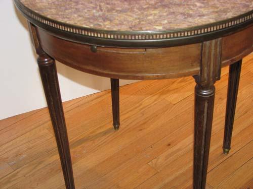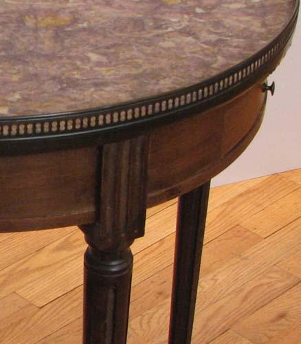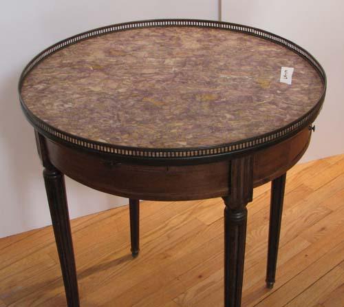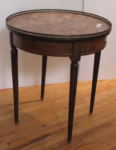 Title: Round Walnut Table, Pink Marble Top with Brass gallery, 2 drawers and 2 candlestands