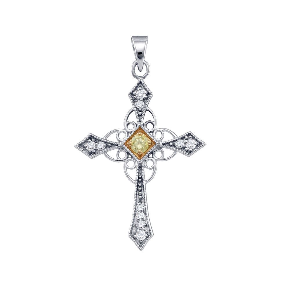REF-24H5W - SKU: GD65242 ---- Round Yellow Color Enhanced Diamond Cross Pendant 1/3 Cttw 10kt White Gold