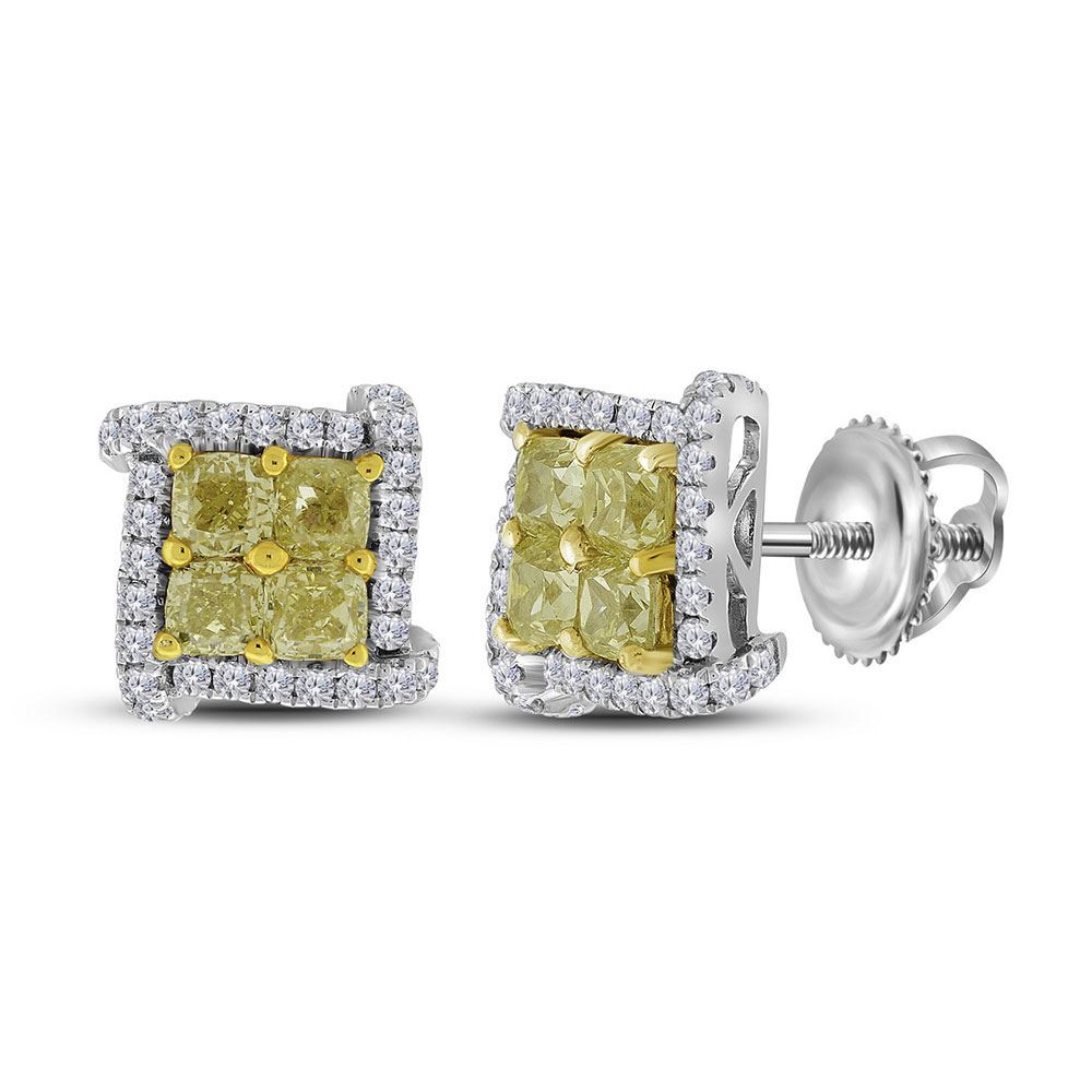 REF-388K2R - SKU: GD96986 ---- Round Yellow Color Enhanced Diamond Square Cluster Earrings 1-1/2 Cttw 18kt White Gold