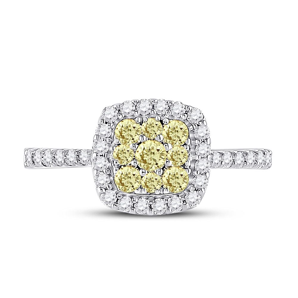 Round Yellow Diamond Square Cluster Ring 3/4 Cttw 14KT White Gold