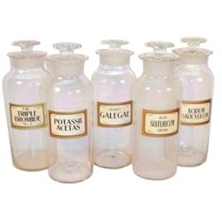 Round apothecary bottles (5), paper labels, ea. 9.5"H.