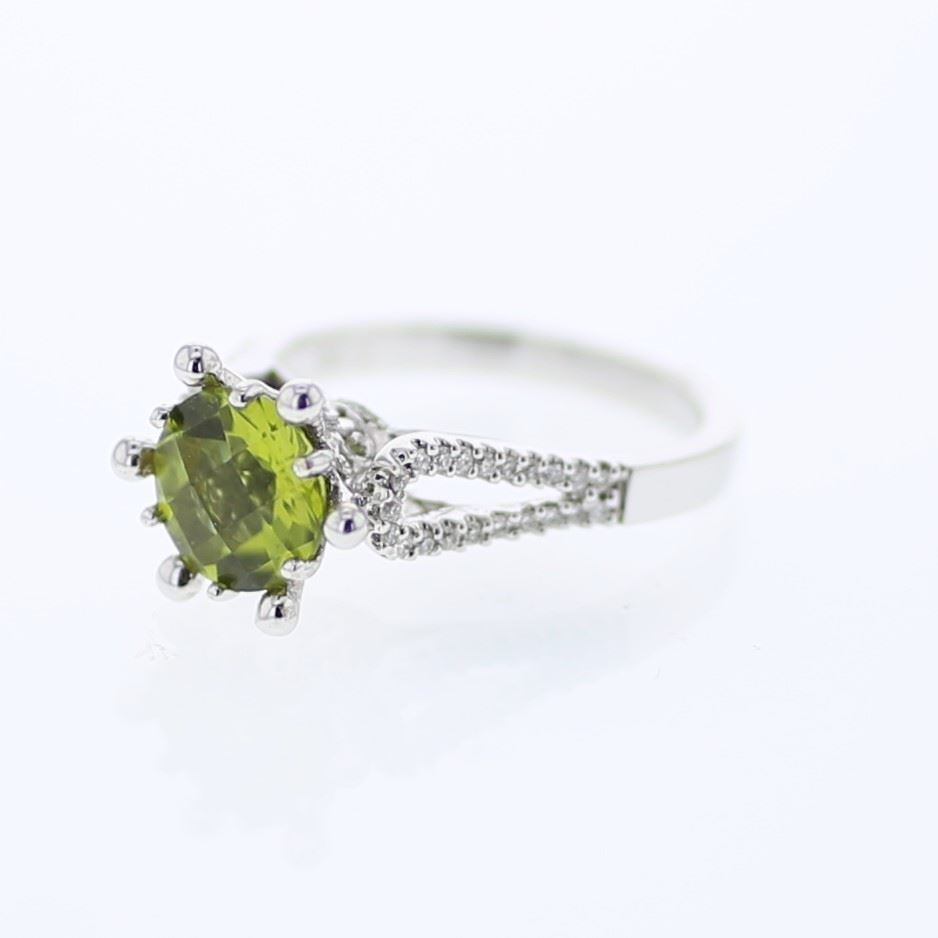 Round cut Peridot w/ Prong-set Diamond Ring in 18K White Gold