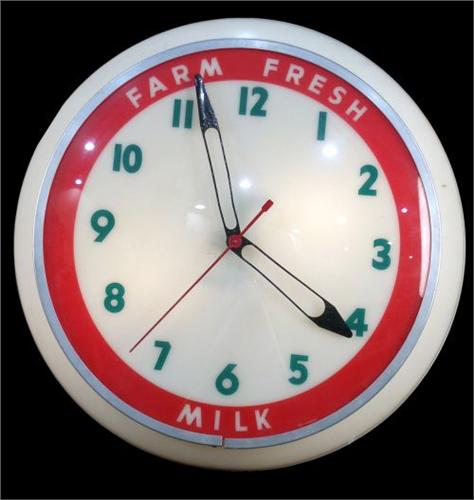 Round electric clock 16 " diameter "Farm Fresh Milk" works