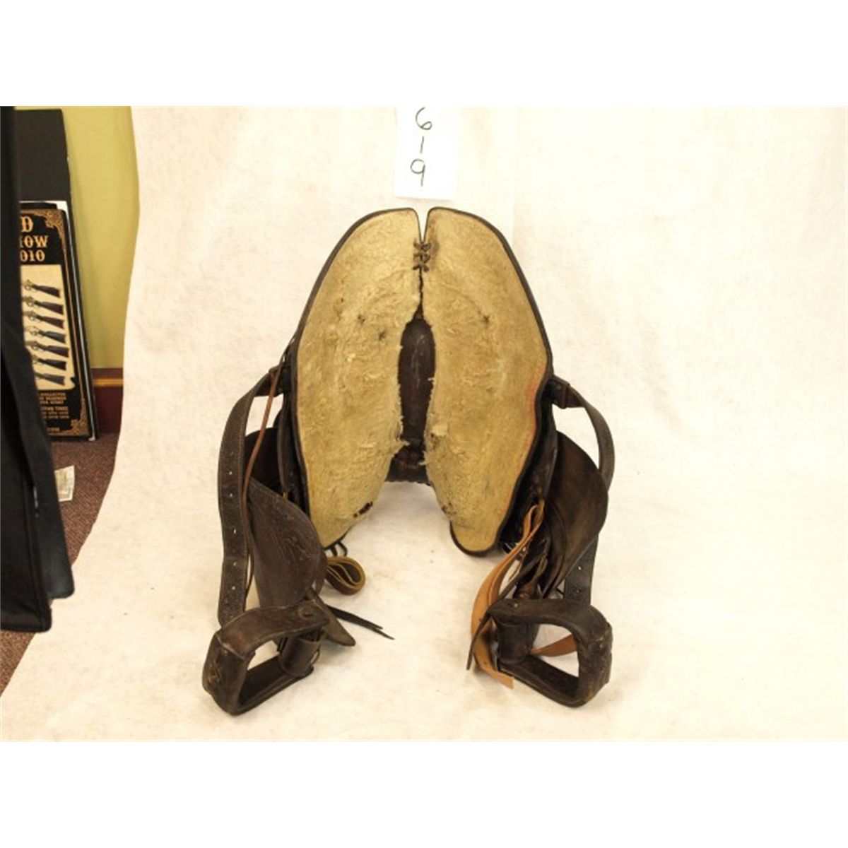 Round skirt saddle stamped Lewiston Saddle Co. Lewiston Idaho full floral carved with carved rearing horse to each fender, engraved silver mounted horn cap, 14" seat.