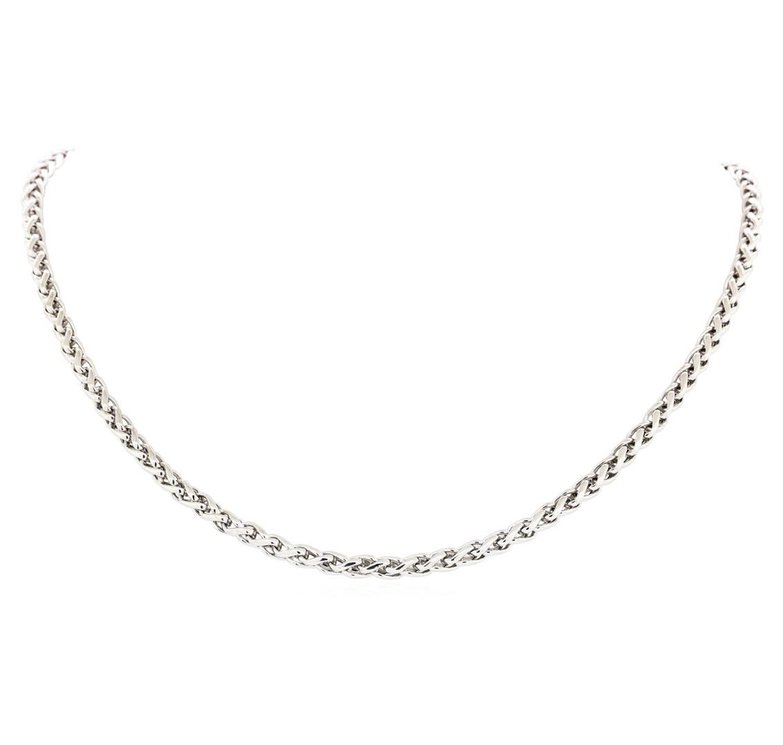 One rounded wheat link chain featuring: 18KT white gold weighing 15.8 grams. The chain measures approximately 18 inches in length.