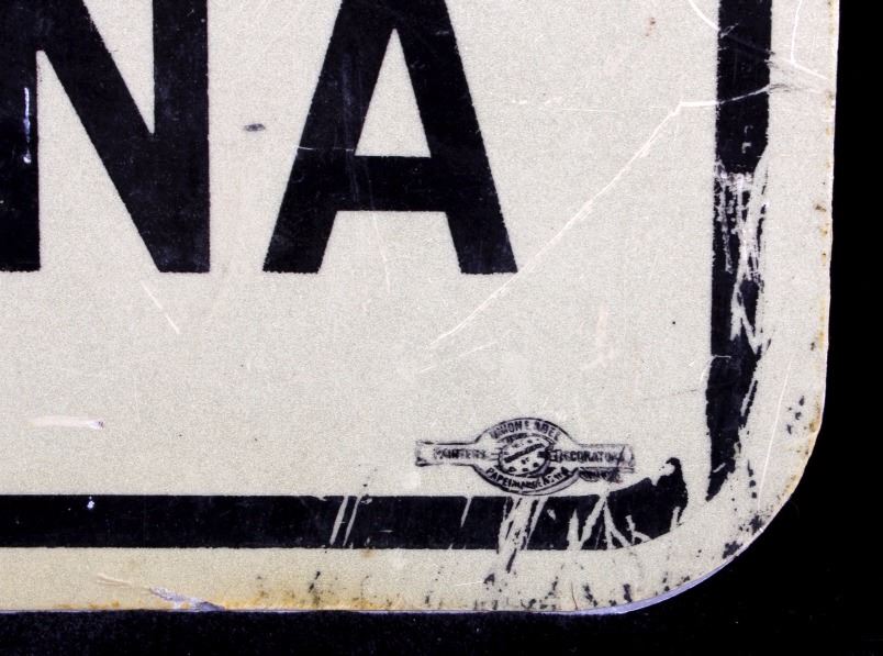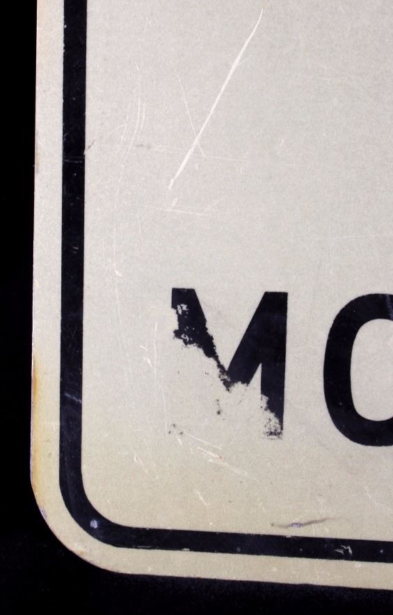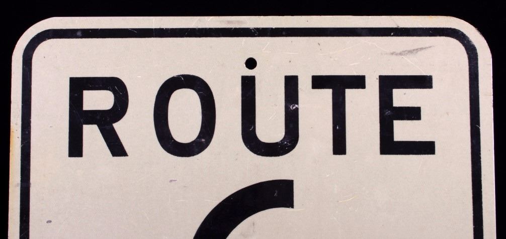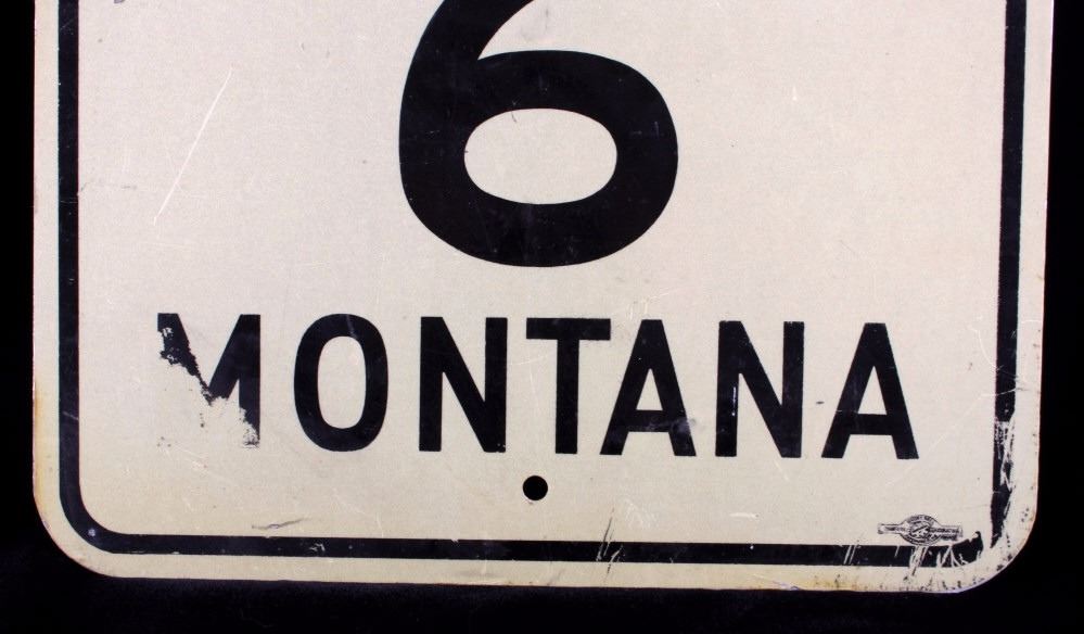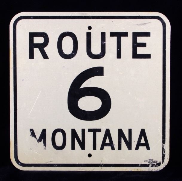 This is an original Route 6 highway sign from Montana. The sign reads "Route 6 Montana". The sign shows good overall condition. It does have some damage to the "M" as shown. The sign measures 15" x 15".