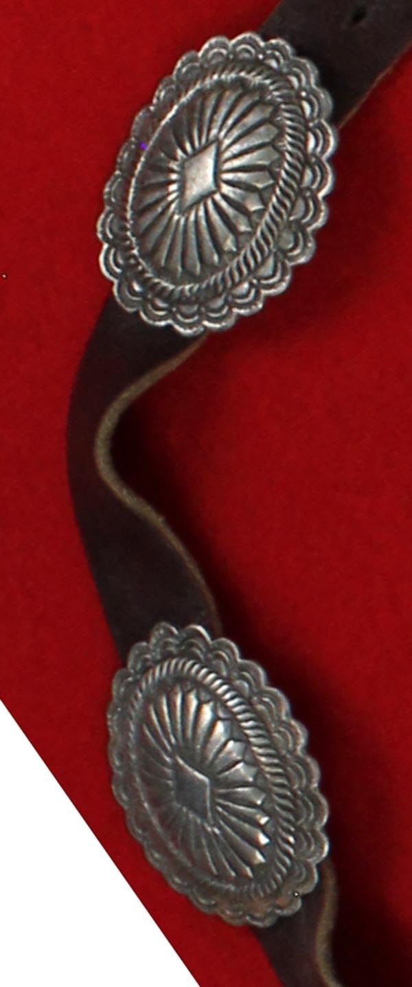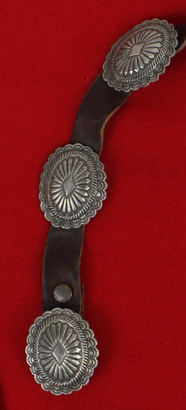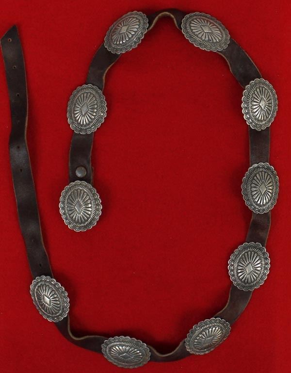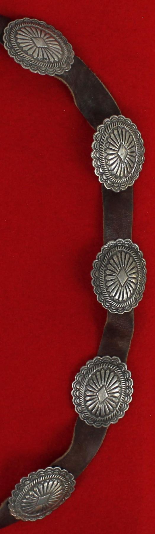 Route 66 Concho Belt 41''end to end, Conchos are on old leather belt. Belt is 3/4'' W & is 41'' end to end. There are nine conchos that are 2''L x 1 1/2''W. Buckle is also a concho made into a buckle.