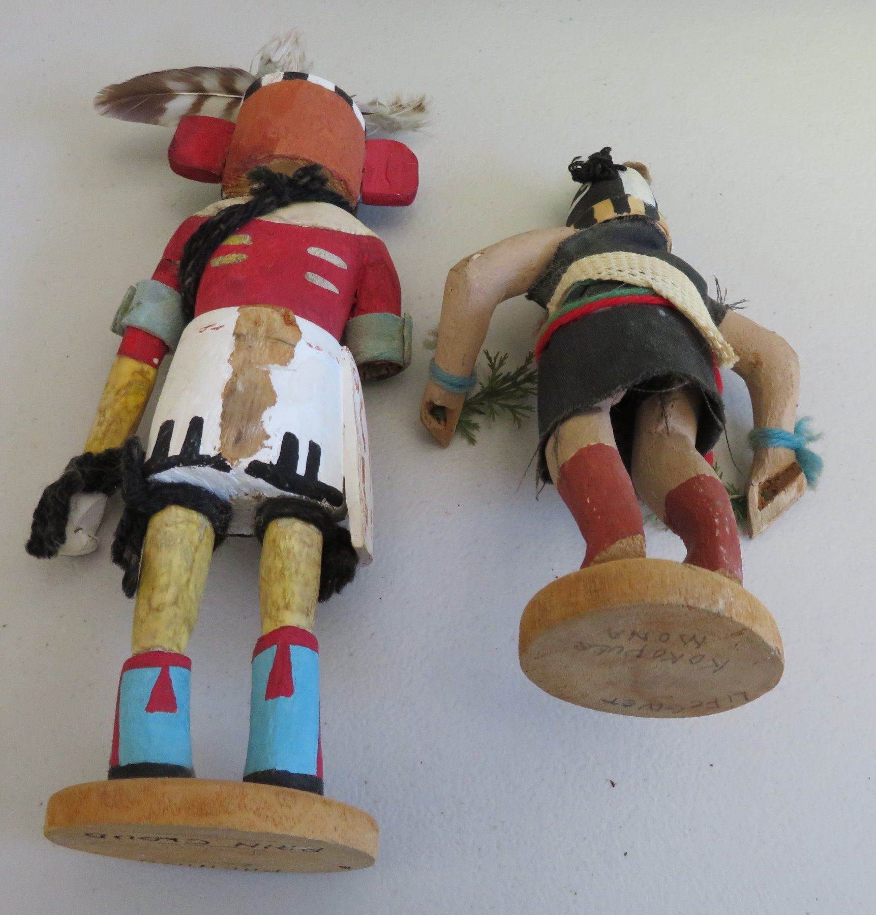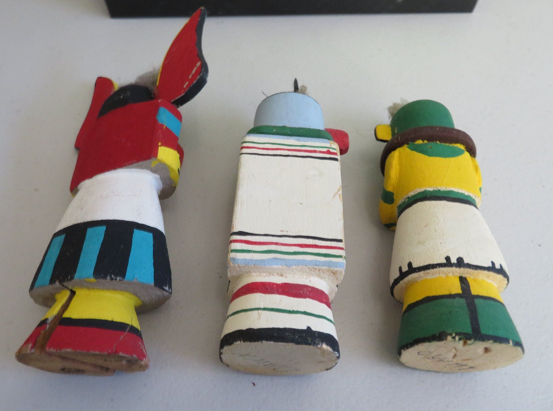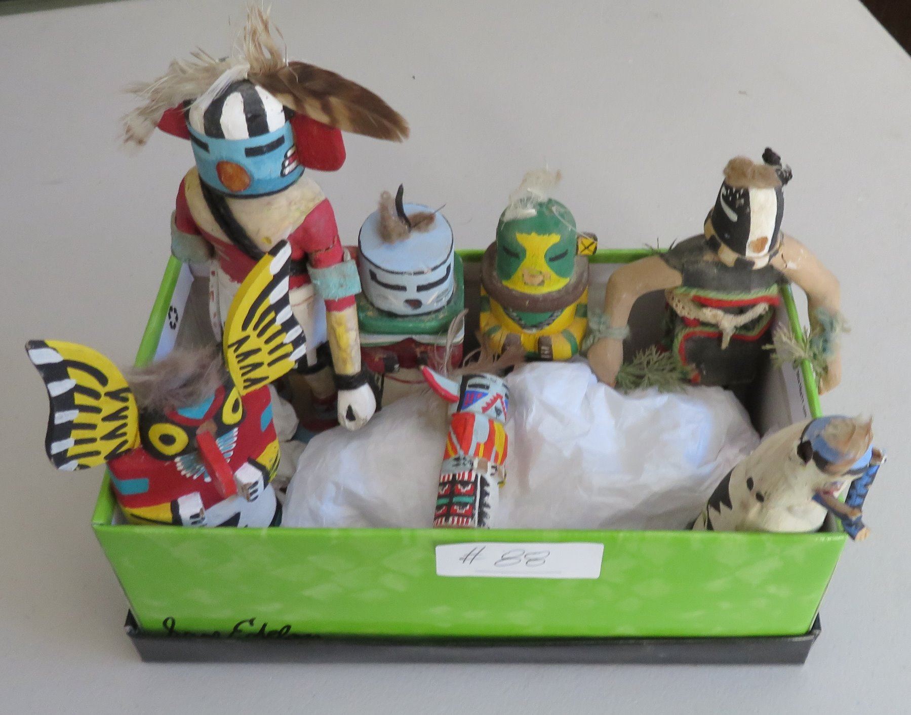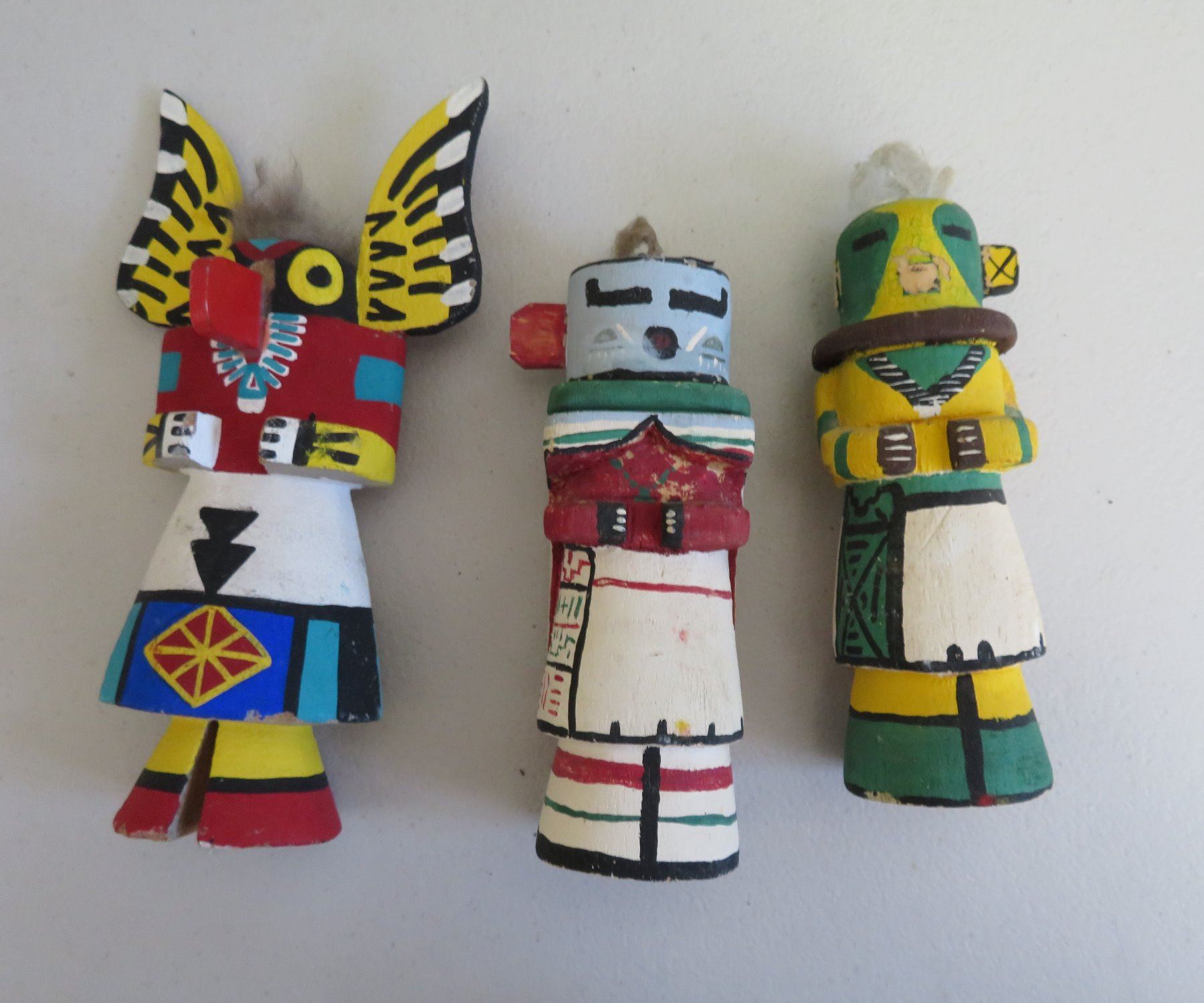 Route 66 Kachina Collection, c. 1950s. Made of cottonwood and paint, the items measure from 6" to 10" tall. Arizona. Condition: Pre-owned, some damage, see images. Shipping: $34.50 w/insurance and signature, double-boxed.