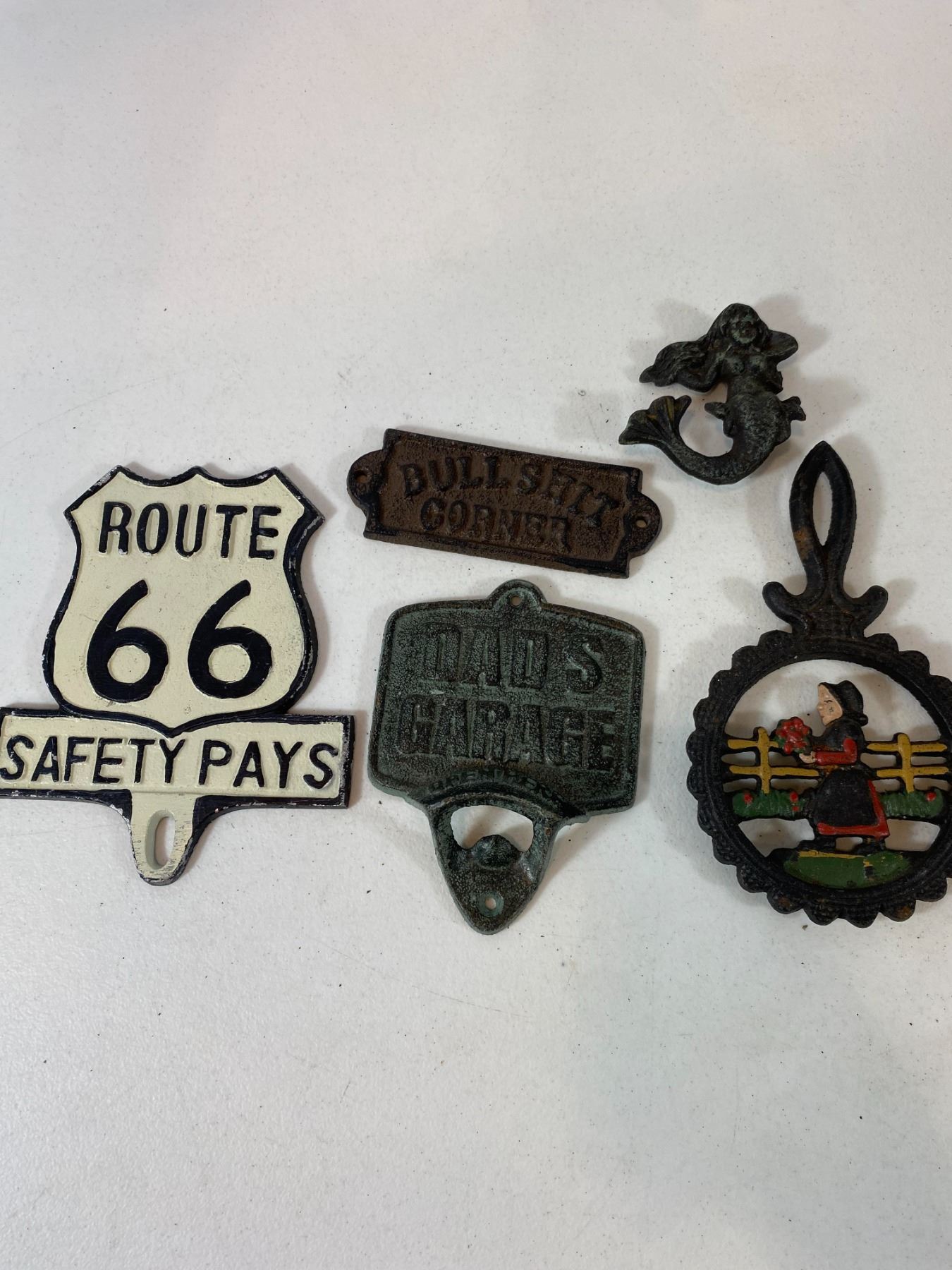 Assorted group of cast iron wall plaques and openers including a white 'Route 66 Safety Pays' shield sign, 'Bull Shit Corner' plaque, 'Dad's Garage' wall-mount opener, a small mermaid figure and a painted Dutch girl trivet. Pieces range from approx. 3 to 8 in. Some paint chipping and light surface rust. All items are modern reproductions in cast-iron style and offered as decorative collectibles.