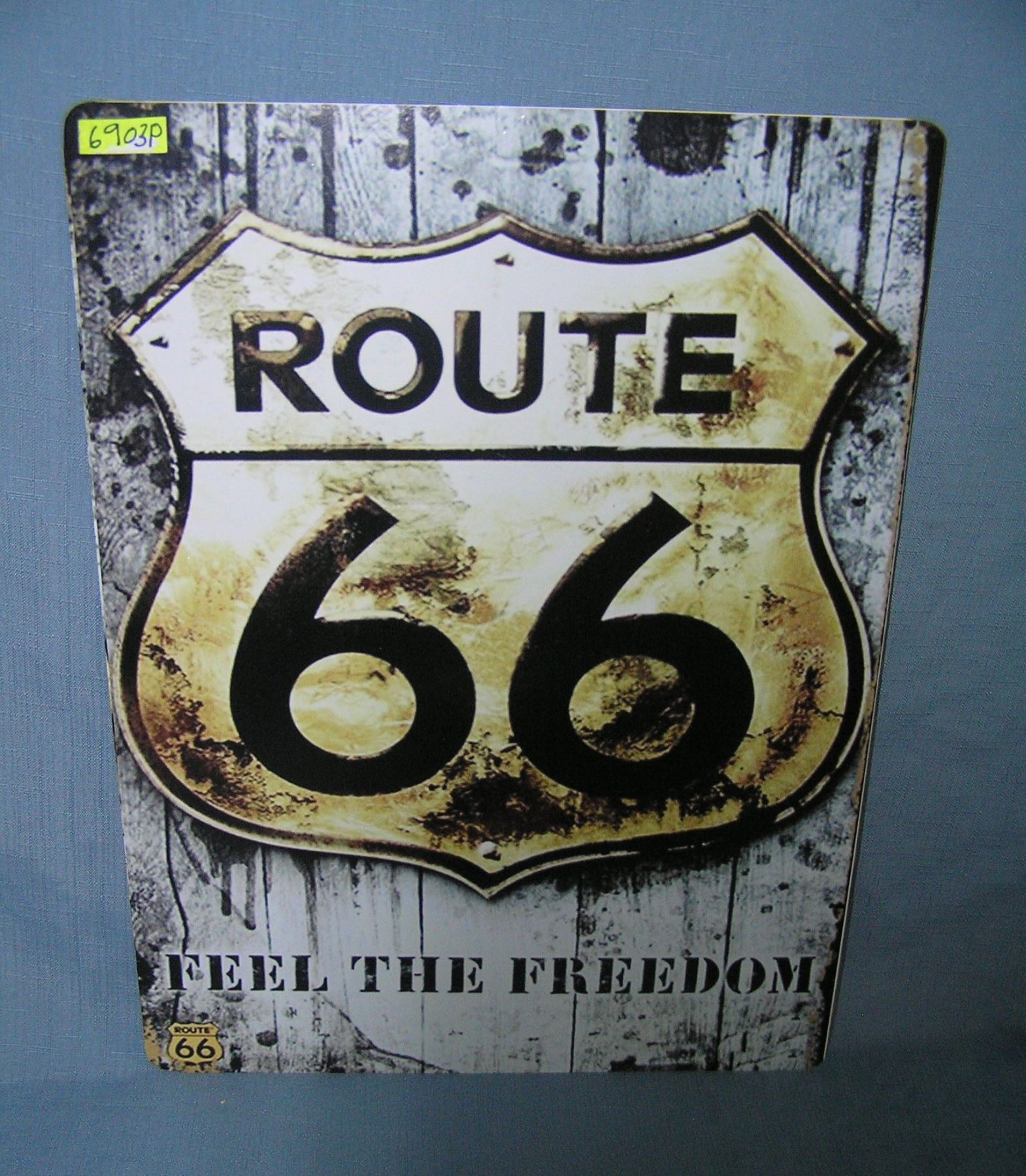 Route 66 feel the freedom retro style advertising sign printed on PVC hardboard these signs are auctioned for their decorative and display purposes 12 inches by 16 inches est. value $50.00-$60.00
