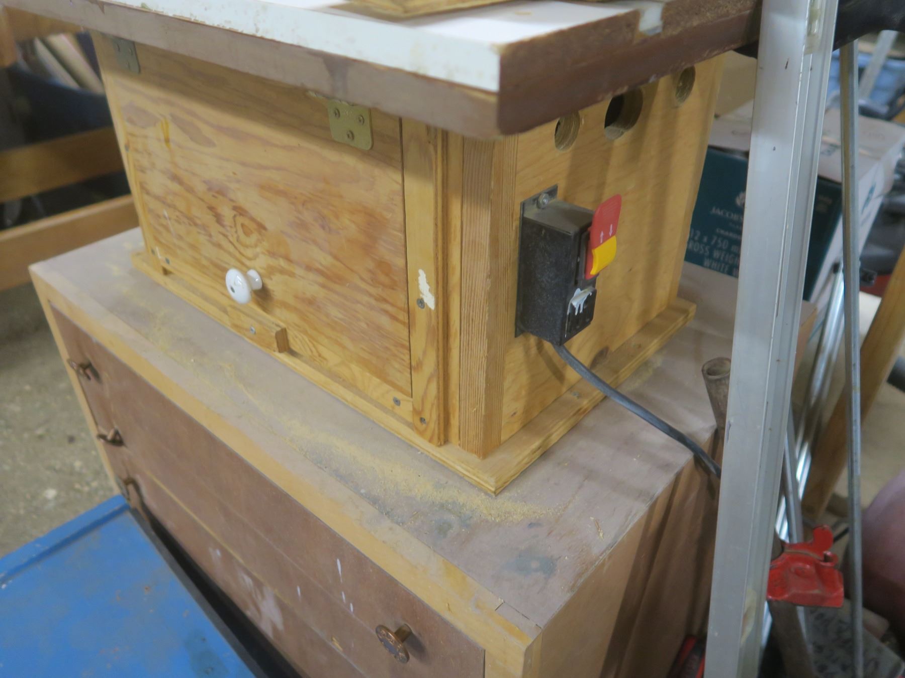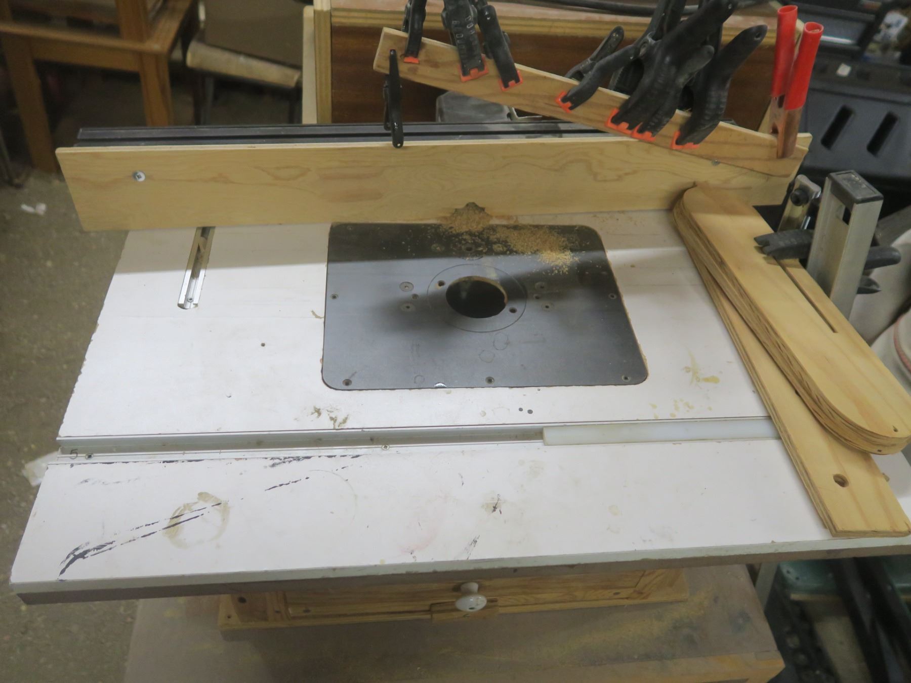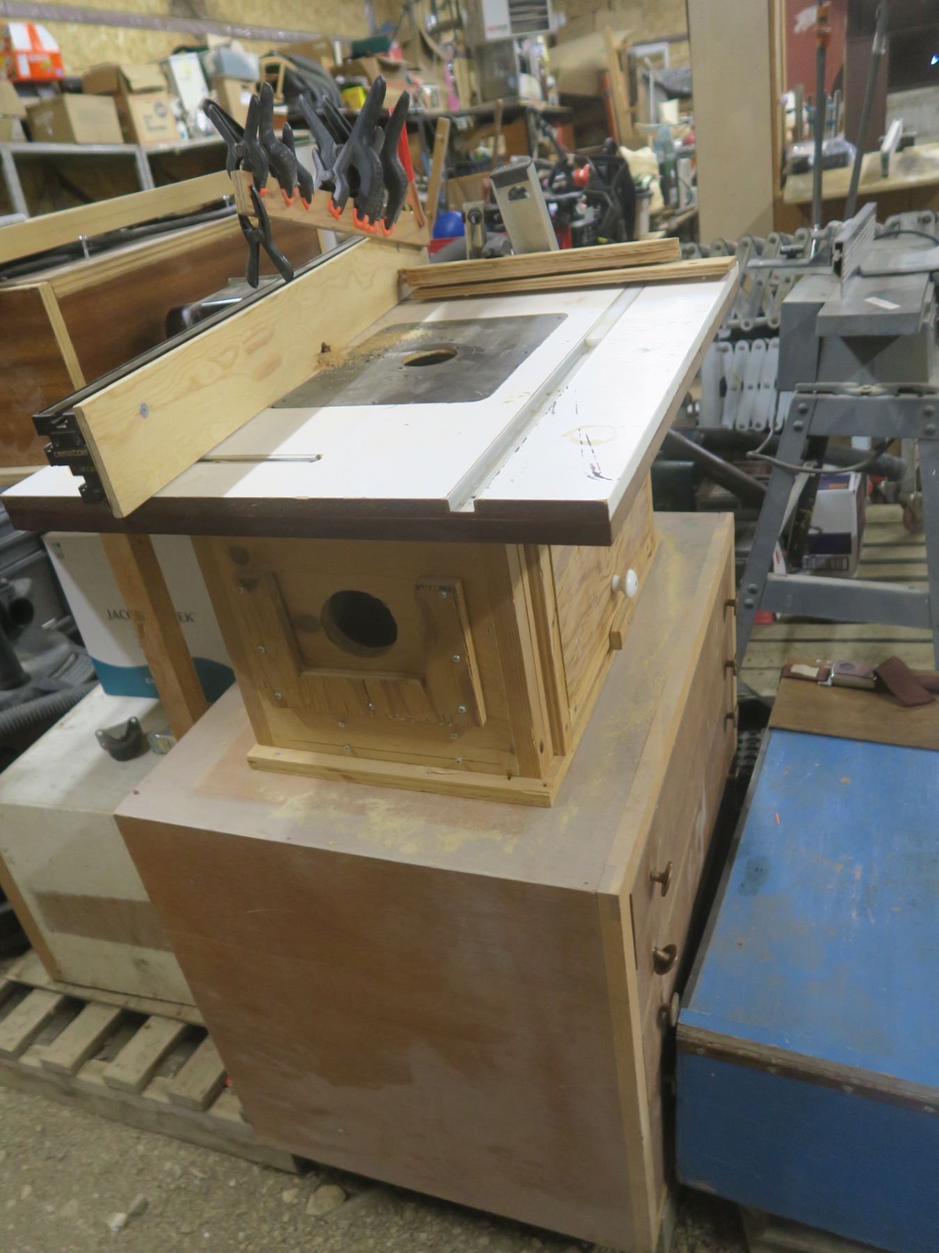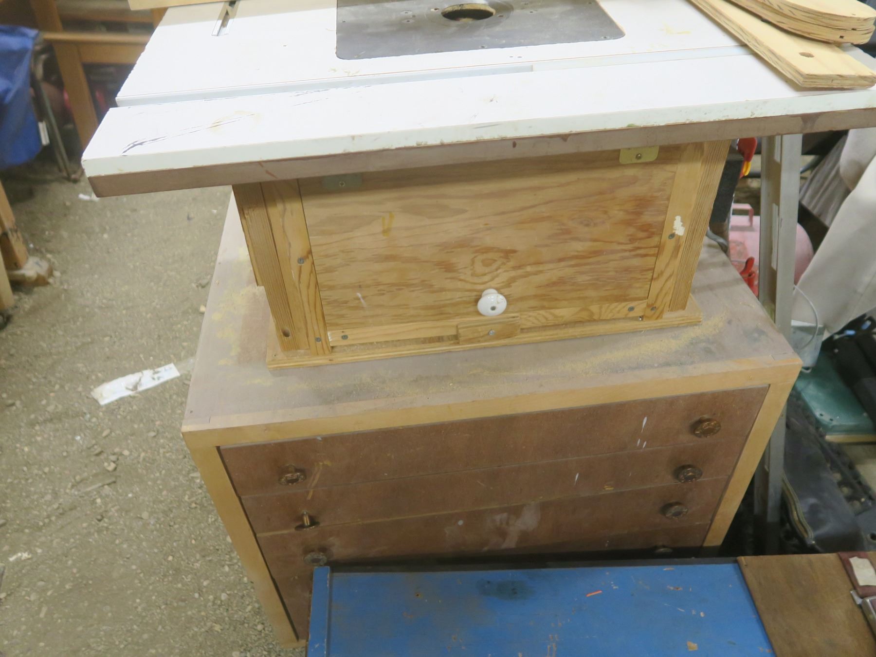 Router table on four drawer rolling cabinet. Table includes a Jessem router lift, and Lee Valley adjustable fence