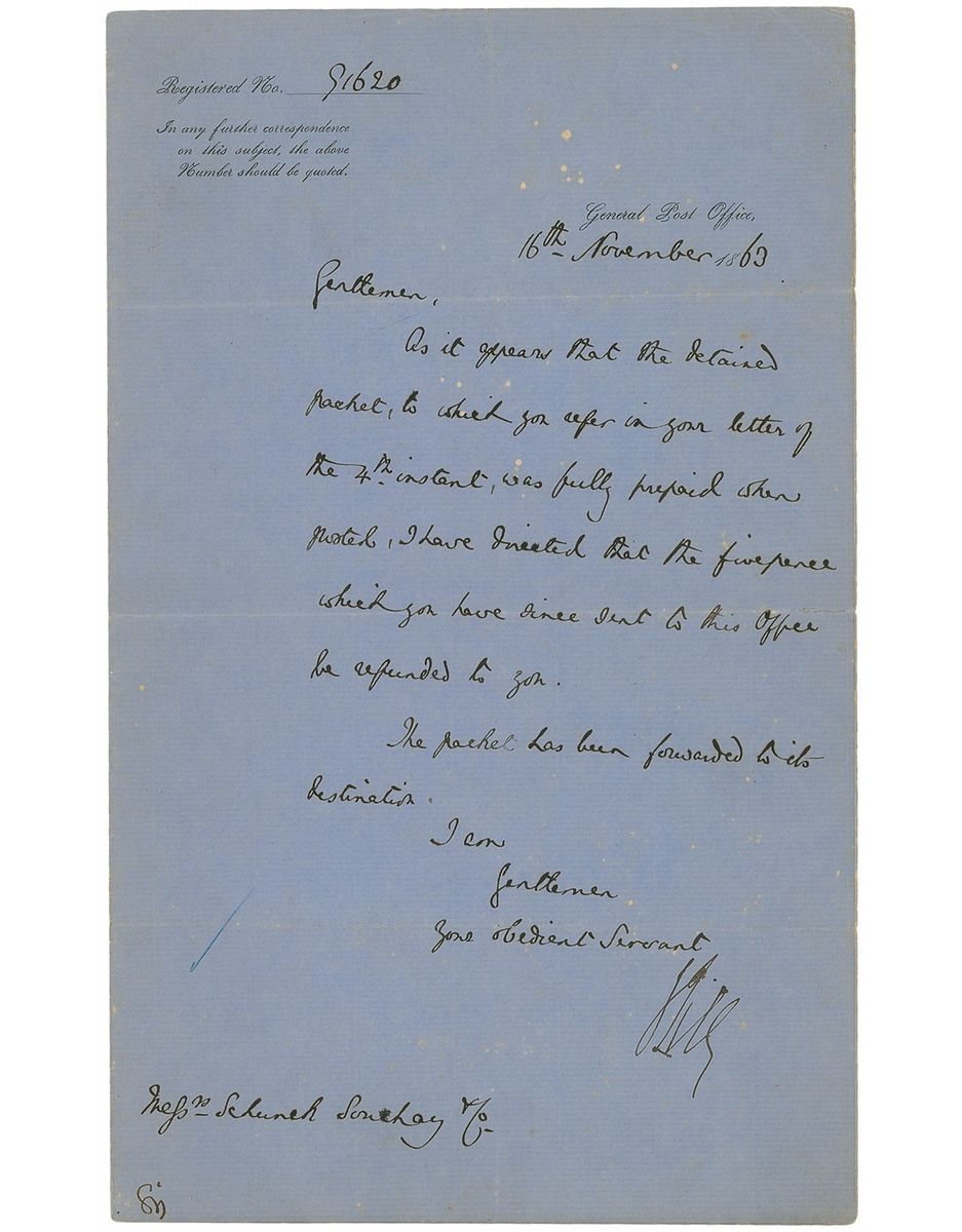 Advocate of postal reforms (1795–1879) including uniform low rates and prepayment by means of postage stamps. LS signed “Hill,” one page, 8 x 13, General Post Office letterhead, November 16, 1863. In part: “As it appears that the detained packet, to which you refer in your letter…was fully prepaid when posted, I have directed that the five pence which you have since sent to this Office be refunded to you.” Intersecting folds with one small tape-repaired edge separation and scattered spots of discoloration, otherwise fine condition.