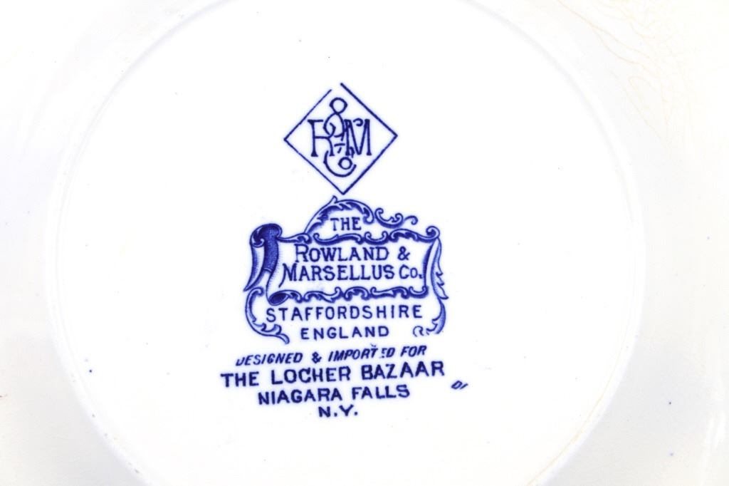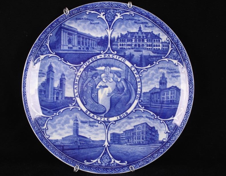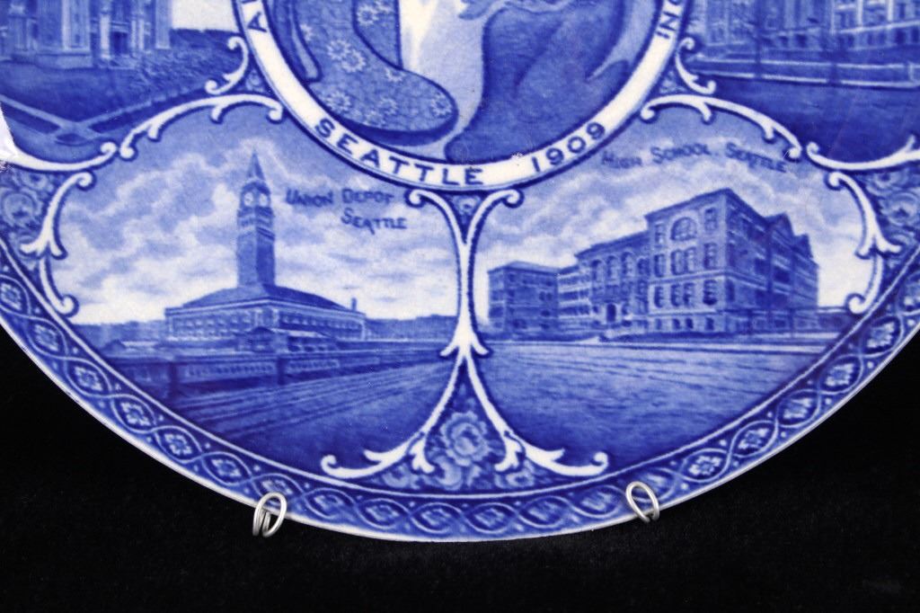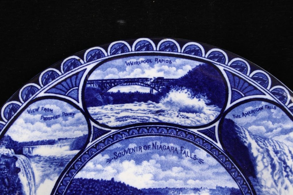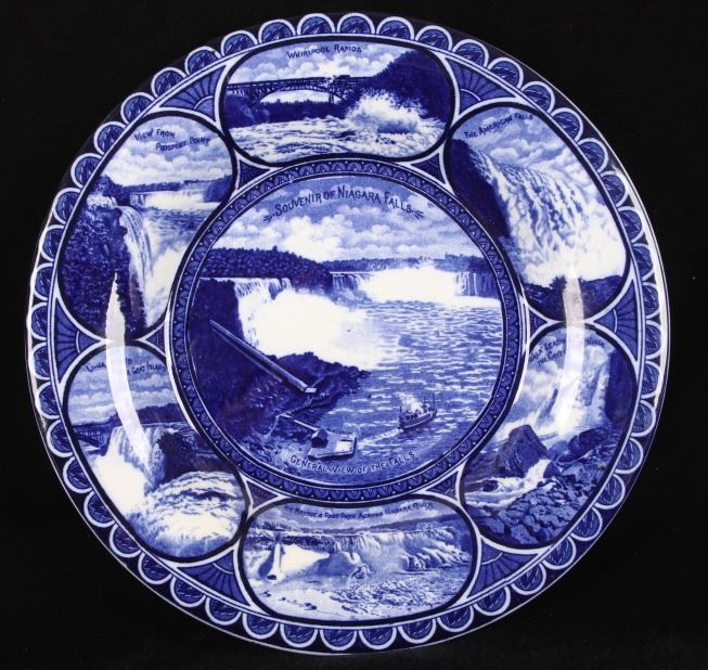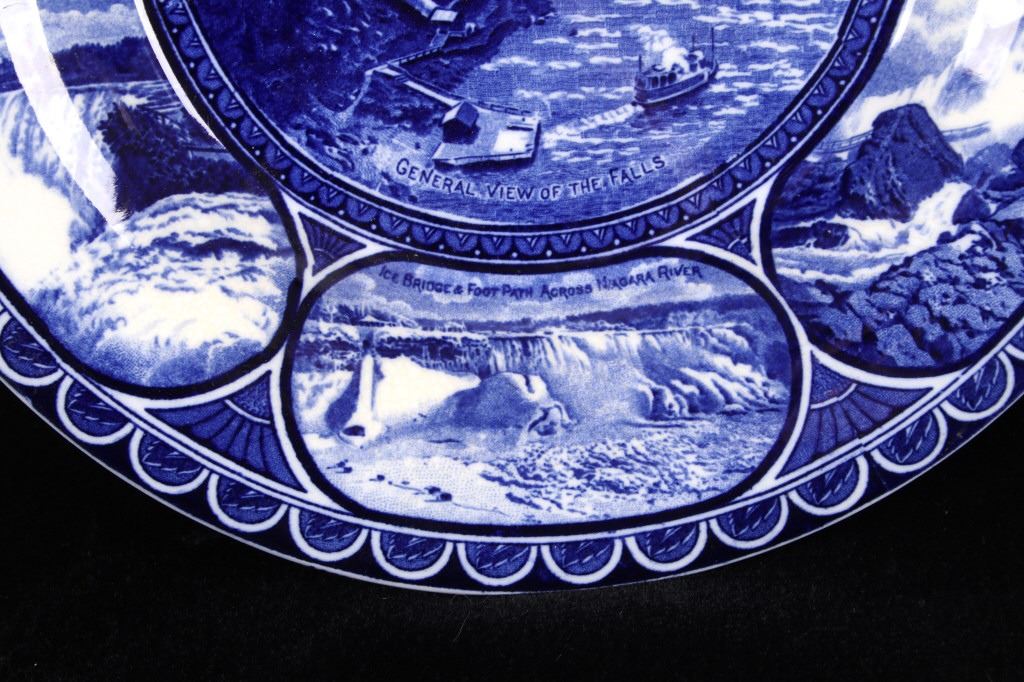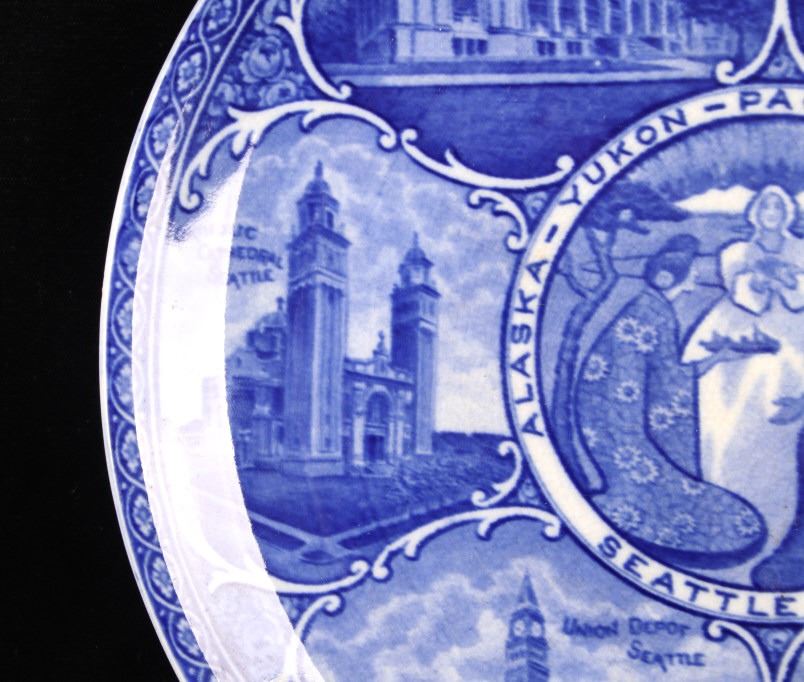 This lot includes two (2) Rowland & Marcellus Co. (Staffordshire, England) decorated Transferware 10" plates: one Alaska-Yukon-Pacific Exposition 1909 World's Fair Flow Blue China Plate commemorates the 1909 Alaska Yukon Pacific Exposition, a world's fair held in Seattle. Plate shows the medallion logo used for the fair depicting three women in a circle. Alaska is represented in the center with the woman holding gold, aurora borealis behind her. The Yukon is represented on the right with a train showing new commerce. The Pacific is represented by Japan, woman on left with ocean liner, showing increased trade. And, around the rolled rim are cartouches of the buildings built for the fair. Plate has deep flow blue coloring, deeply indented center - almost like a dish more than a plate. Also included is a Transferware Flow Blue 10" plate circa 1890s of Niagara Falls depicted in the center medallion surrounded by cartouches on the rolled rim of "Whirlpool Rapids", "The American Falls", "Walk Leading to Cave of the Winds", "Ice Bridge & Footpath Across Niagara River", "Luna Island from Goat Island" and "View from Prospect Point".