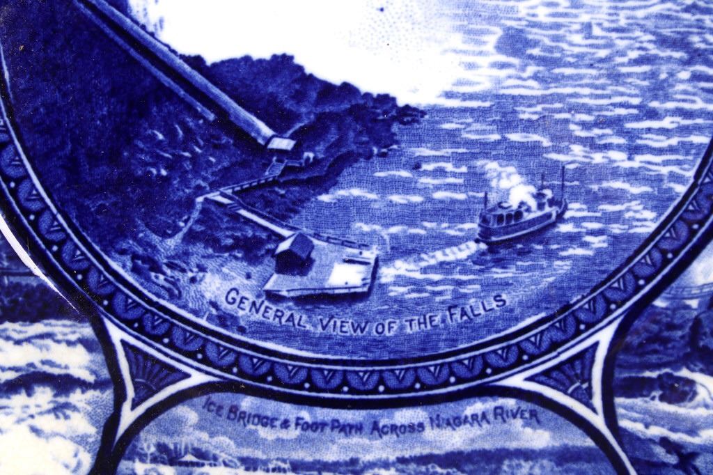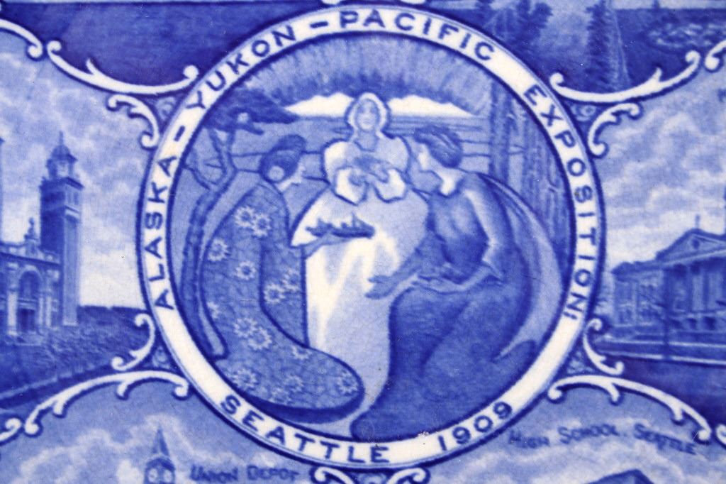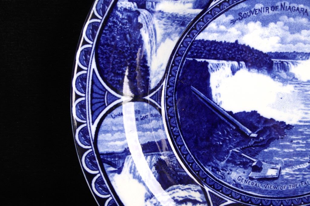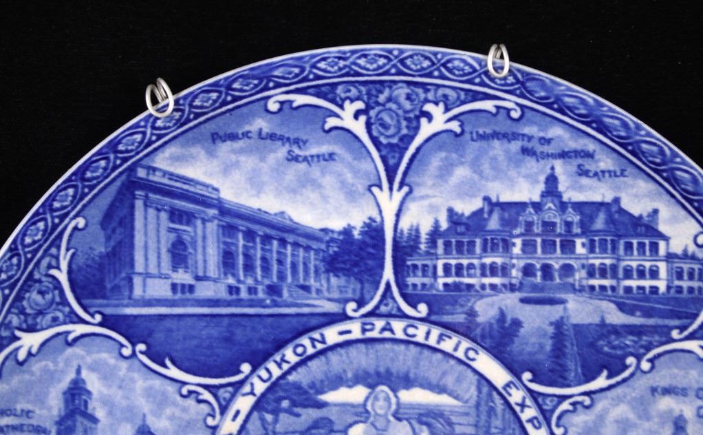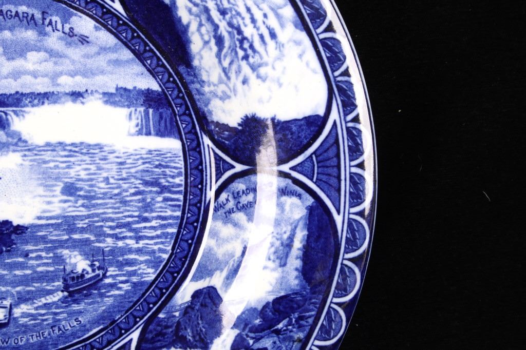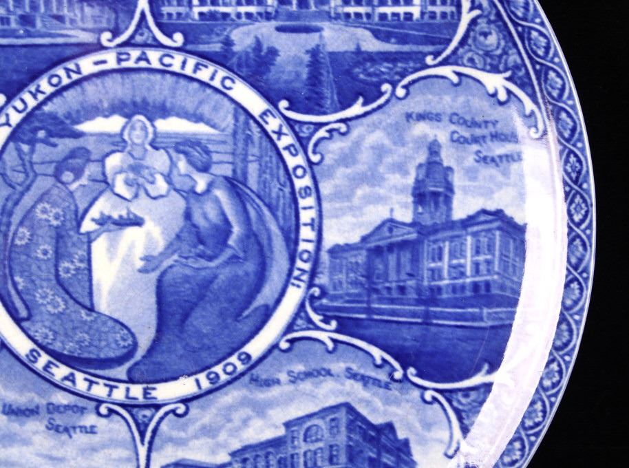 This lot includes two (2) Rowland & Marcellus Co. (Staffordshire, England) decorated Transferware 10" plates: one Alaska-Yukon-Pacific Exposition 1909 World's Fair Flow Blue China Plate commemorates the 1909 Alaska Yukon Pacific Exposition, a world's fair held in Seattle. Plate shows the medallion logo used for the fair depicting three women in a circle. Alaska is represented in the center with the woman holding gold, aurora borealis behind her. The Yukon is represented on the right with a train showing new commerce. The Pacific is represented by Japan, woman on left with ocean liner, showing increased trade. And, around the rolled rim are cartouches of the buildings built for the fair. Plate has deep flow blue coloring, deeply indented center - almost like a dish more than a plate. Also included is a Transferware Flow Blue 10" plate circa 1890s of Niagara Falls depicted in the center medallion surrounded by cartouches on the rolled rim of "Whirlpool Rapids", "The American Falls", "Walk Leading to Cave of the Winds", "Ice Bridge & Footpath Across Niagara River", "Luna Island from Goat Island" and "View from Prospect Point".