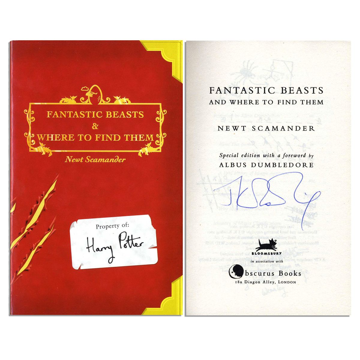 J.K. Rowling signs this clever Harry Potter textbook ''Fantastic Beasts & Where to Find Them.'' Bloomsbury: London: 2001. The author signs upon the title page: ''J.K. Rowling''. Harry ''handwrites'' notes in the textbook, which is mentioned in ''Harry Potter and the Sorcerer's Stone.'' Rowling created the book as a contest prize for Comic Relief, a U.K. charity, and included in the lot is the original letter to the contest winner on Comic Relief letterhead. 4.25'' x 7'' paperback is in fine condition. The scarcest of Harry Potter signed books.