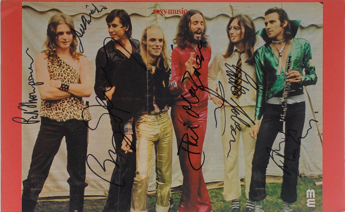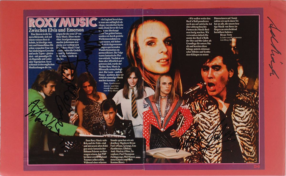 Color 17 x 12 magazine photo of the group, signed in black felt tip by Bryan Ferry, Paul Thompson, Eddie Jobson, Phil Manzanera, Andy Mackay, and one other. Affixed to a slightly larger sheet of red construction paper. A magazine article spread about Roxy Music is affixed to the reverse, also signed in black felt tip by Andy Mackay, Paul Thompson, Phil Manzanera, and Eddie Jobson. Scattered wrinkling and noticeable central vertical fold, otherwise fine condition. Consignor notes that the signatures were obtained in person.