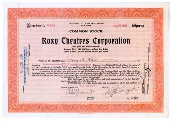 1926, New York. Stock certificate for 4 share. Orange/Black. Signed as President by Samuel L. Rothafel (1881-1936). A pioneer in surrounding his programs with a luxurious decor, Rothafel became the most successful motion-picture theatre operator in the world. Very fine condition. Uncancelled.