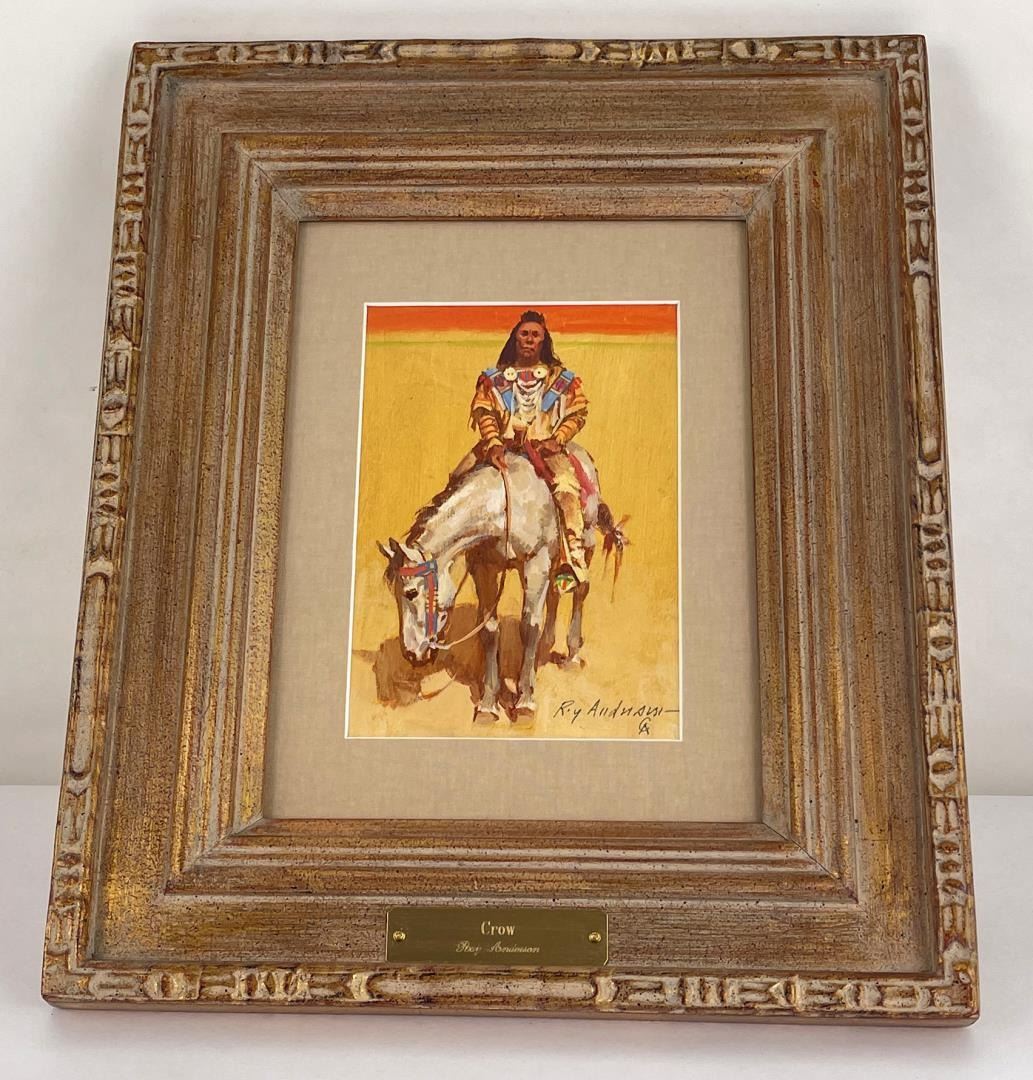 15" by 12 1/2" framed. Title is Crow. 5" by 7" unframed. Roy H. Andersen (1930 - 2019) was active/lived in Arizona, New Hampshire. Roy Andersen is known for Indian-western genre, landscape, mural. Known as a western painter, Roy Andersen did paintings of Crow, Cheyenne, and Apache Indians. He began his career living in Chicago and New York and working as an illustrator. He did numerous covers for Time Magazine including portraits of Albert Einstein and Prince Fahd. He also did illustrations for National Geographic magazine, and did a stamp series on Dogs and American Horses, and in 1984 and 1985, won Stamp of the Year Award. As a muralist, he has filled commissions for the National Park Service, the Royal Saudi Naval Headquarters, and the E.E. Fogelson Visitor Center at Pecos National Monument in New Mexico. To pursue his talent for painting, Roy Anderson went West, living in Arizona and settling in Cave Creek. In 1990, he was voted official artist for Scottsdale's Parada del Sol, the "world's largest" horse-drawn parade commemorating the Old West. Andersen grew up on an apple farm in New Hampshire and learned about Indian customs from his many hours spent at the Chicago Museum of Natural History. He is meticulous about being historically accurate in his paintings. Of him it was written: "There are no 'happy accidents' in an Andersen painting. He has a knowledge of his subject that is attained only through extensive research. You will not find an Apache medicine bag around a Sioux warrior's neck nor a Cheyenne carrying a rifle that is a bit too 'modern'. What you will see is accuracy, an almost uncanny sense of composition and color harmony and a strength of drawing that is remarkable. " (Dickerson) His training is from the Chicago Academy of Fine Art and the Art Center School of Los Angeles. Influenced by a cowboy uncle from Nebraska, he often painted cowboy scenes that his art teachers said were passe. For thirty years, he was an illustrator for National Geographic, Time magazine and Sports Illustrated and lived in New York and Chicago. And then he "went West looking for peace and a place where he could be his own man in both his life and his art" (Prix de West, 14). He lived in Arizona and Texas. In 1989, he was voted into membership into the Cowboy Artists of America*, a group from whom he has received recognition at the annual exhibitions: Oil Painting Award, Silver, 1999 and Drawing and Other Media, Silver, 2000. Allard Auction Collection Inv: WAE 19233