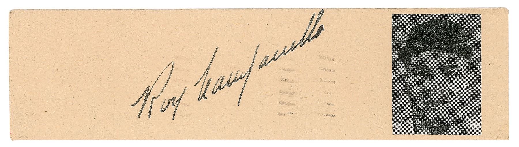 Fountain pen signature, "Roy Campanella,” on an off-white 5.5 x 1.5 card clipped from a government postcard, which bears an affixed image of the Dodgers great. In fine condition, with a light postal cancellation. Accompanied by a modern glossy photo of Campanella in uniform.